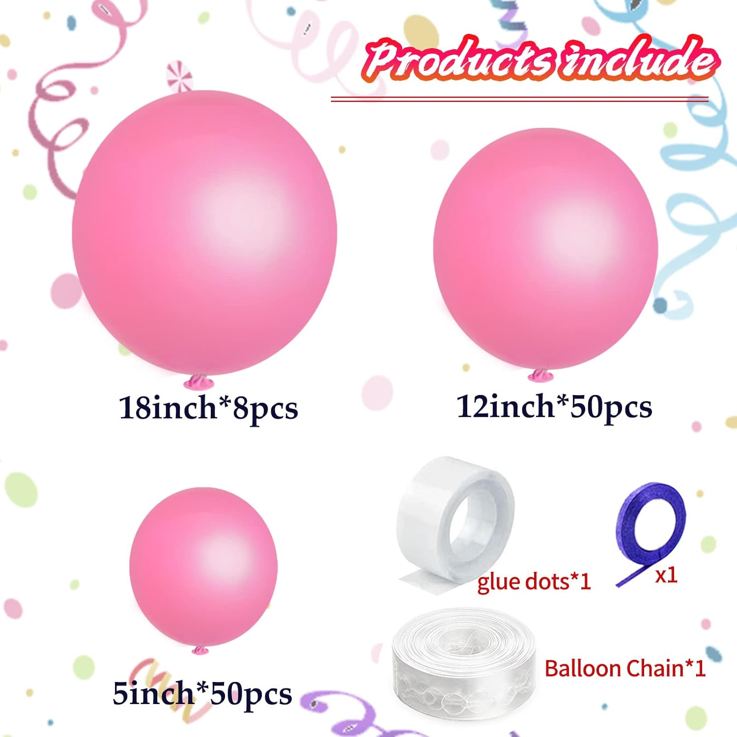 - Pink balloon garland kit: 111Pcs Pink balloons pack, including 8 pcs 18 inch balloons, 50 pcs 12 inch balloons, 50 pcs 5 inch balloons, a 5 meter balloon chain, 100 dots of glue dots, a roll of ribbon.