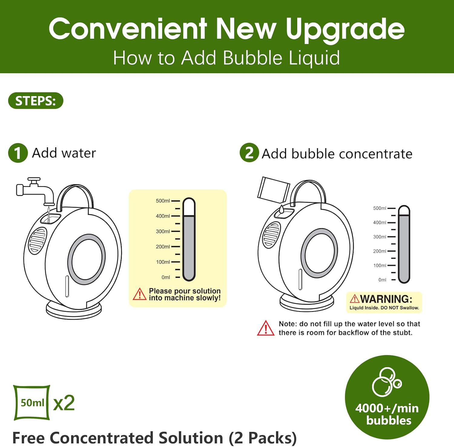 - New Water Injection Port & Free Bubble Fluid: Easier to operate, with the exclusive water filler on the surface of the bubble machine. And you may quickly clean the tank without wasting any bubble fluid by disassembling the bubble machine and removing the entire bubble fluid tank. Tip: It is best to add 50 ml of concentrated bubble solution and 450 ml of water. The solution needs to be shaken before use. Then you will get a lot of bubbles. (2 Packs 50 ml bubble concentrations are available.)