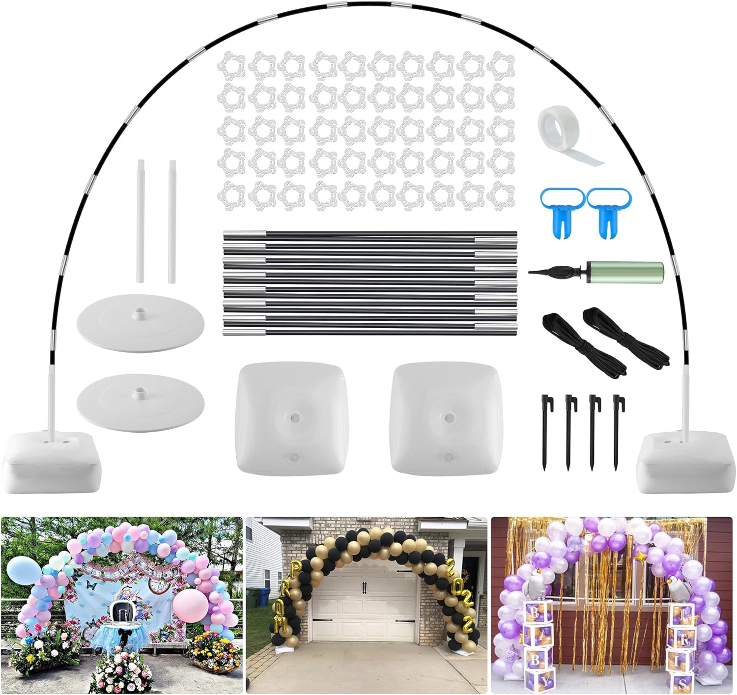 - 【Balloon Arch Kit Includes】: 2 Pvc Base, 2 Pvc Pipe, 2 Water (sand) Fillable Bag, 2 Adapters (the Innovative Necking Design, Already Installed on the Pvc Pipe), 15 Fiberglass Rods , 1 Manual Balloon Pump, 50 Balloon Clips, 2 Balloon Knotter, 2 Ground Secure Rope, 4 Ground Nails, 1 Balloon Tape (100 Glue Points). They Are Enough to Create an Atmospheric High-end Pretty Party Atmosphere.