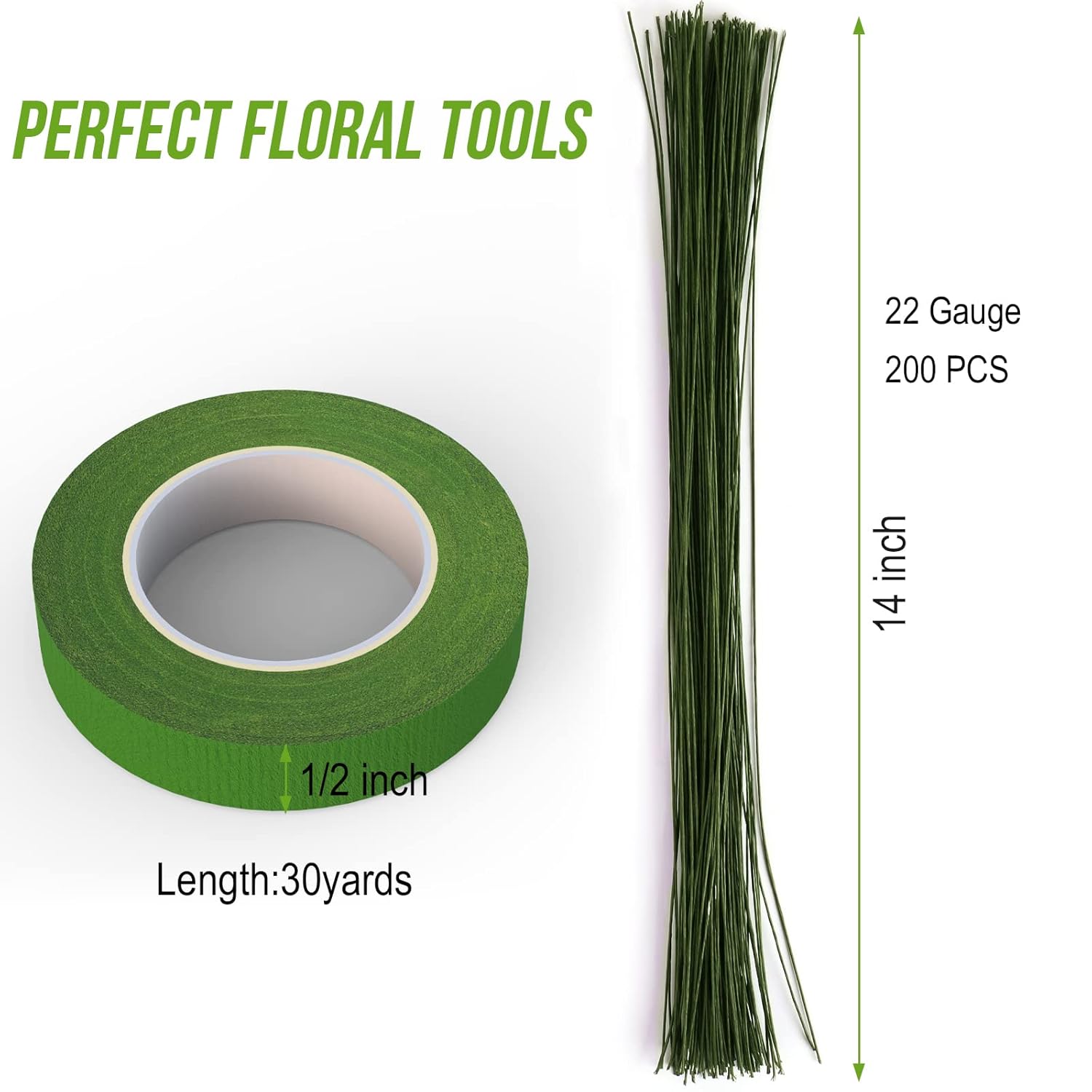 - Great value: This floral tool kit includes 3 rolls of 1/2-inch wide floral tape (30 yards/roll) in dark, medium, and light green, plus 200 pcs 14-inch 22-gauge flexible dark green floral wire. Note: Lower gauge numbers indicate thicker wire