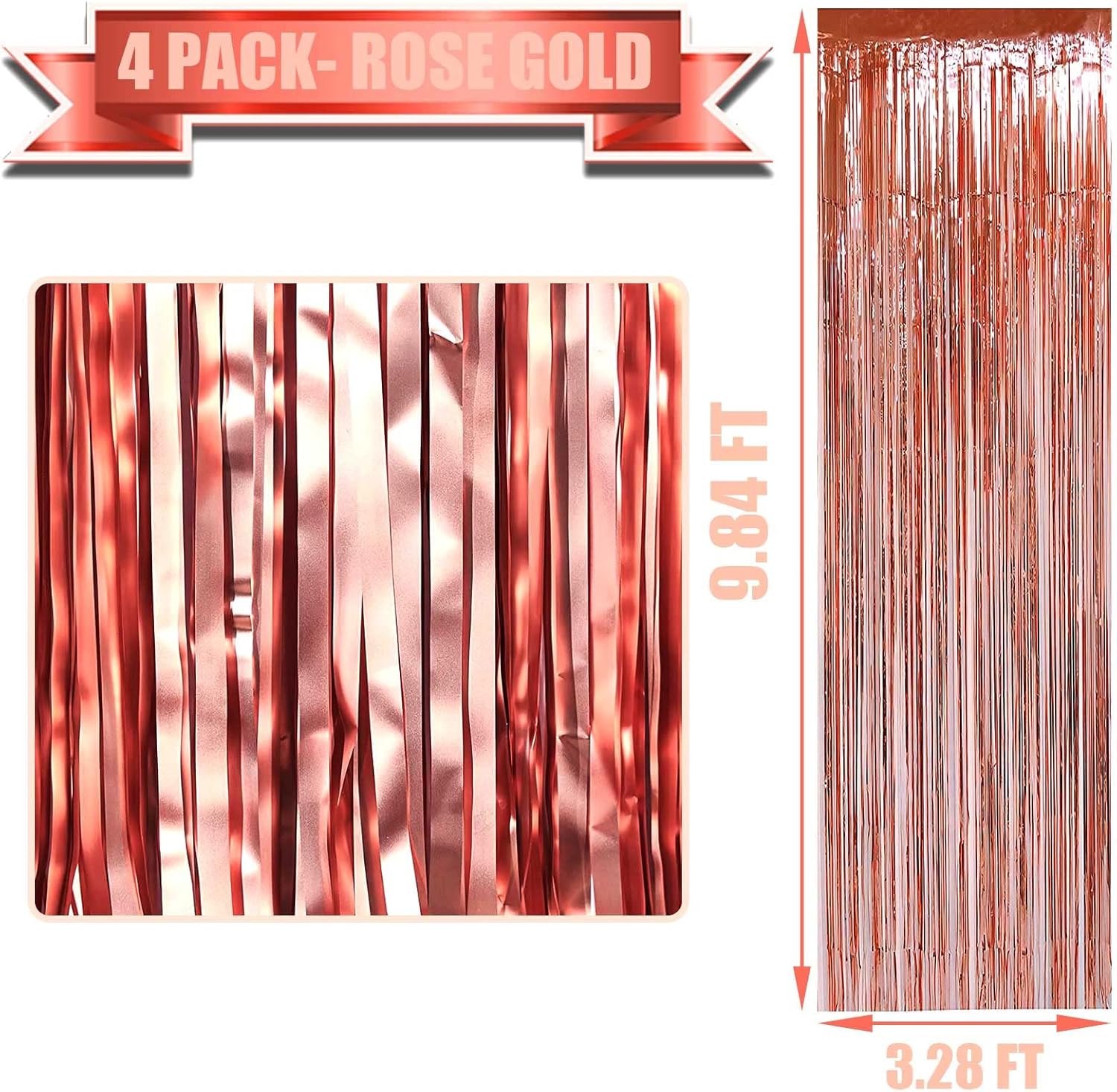 4 Pack Rose Gold Foil Fringe Curtain Backdrop, 3.28Ft x 9.84Ft Metallic Tinsel Foil Fringe Streamers Curtains for Party,