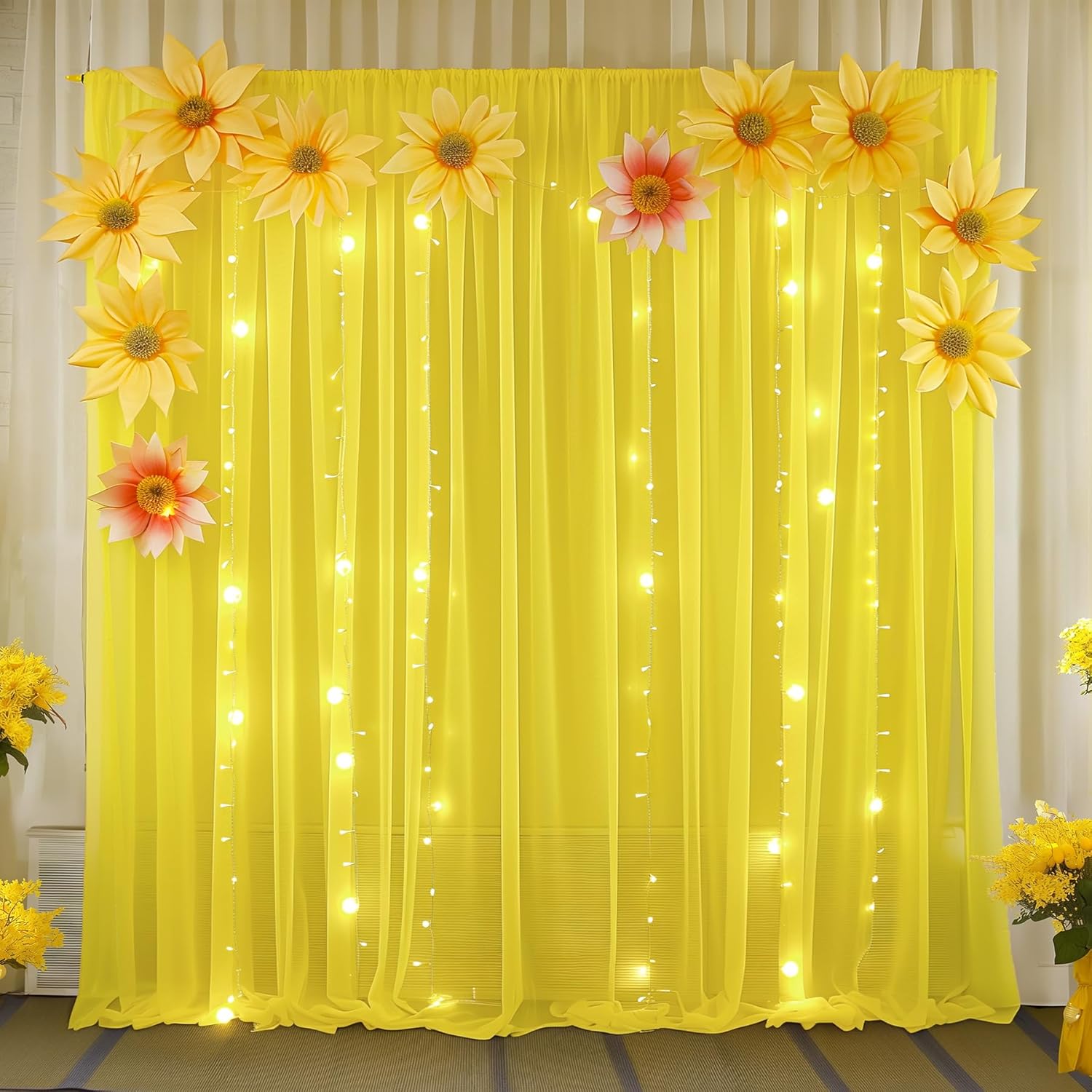 - Elegant Draping Fabric - The yellow backdrop drapes are made of premium quality glossy chiffon fabric,soft and durable. The sheerness is perfect for putting curtain lights behind them. Easy to get these sheer backdrop curtains crease and wrinkle free