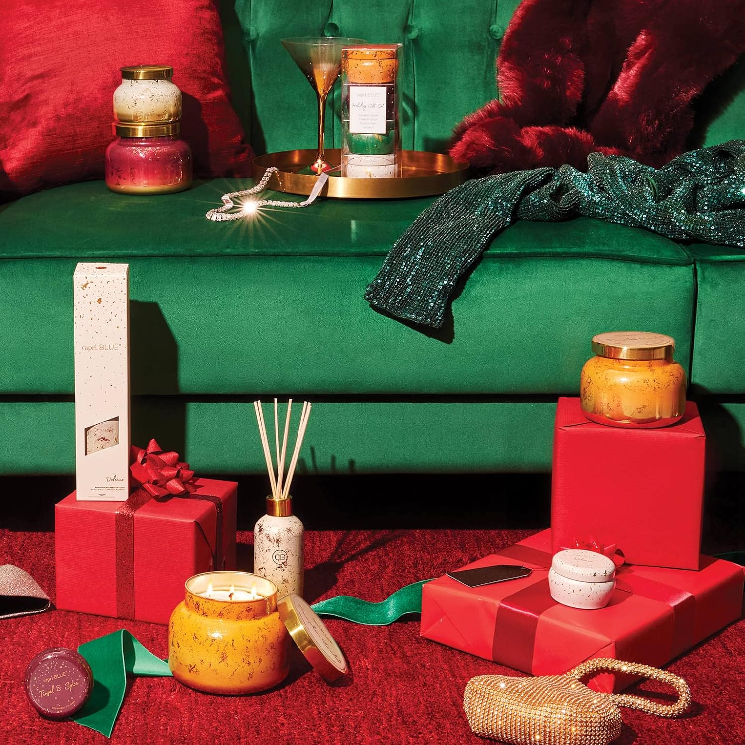 - About Us: Inspired by contemporary fashion trends, Capri Blue creates exciting new products for every season. Our Oversized Glimmer Jar Candles are also available in Capri Blue Volcano, Tinsel & Spice, and Crystal Pine fragrances.