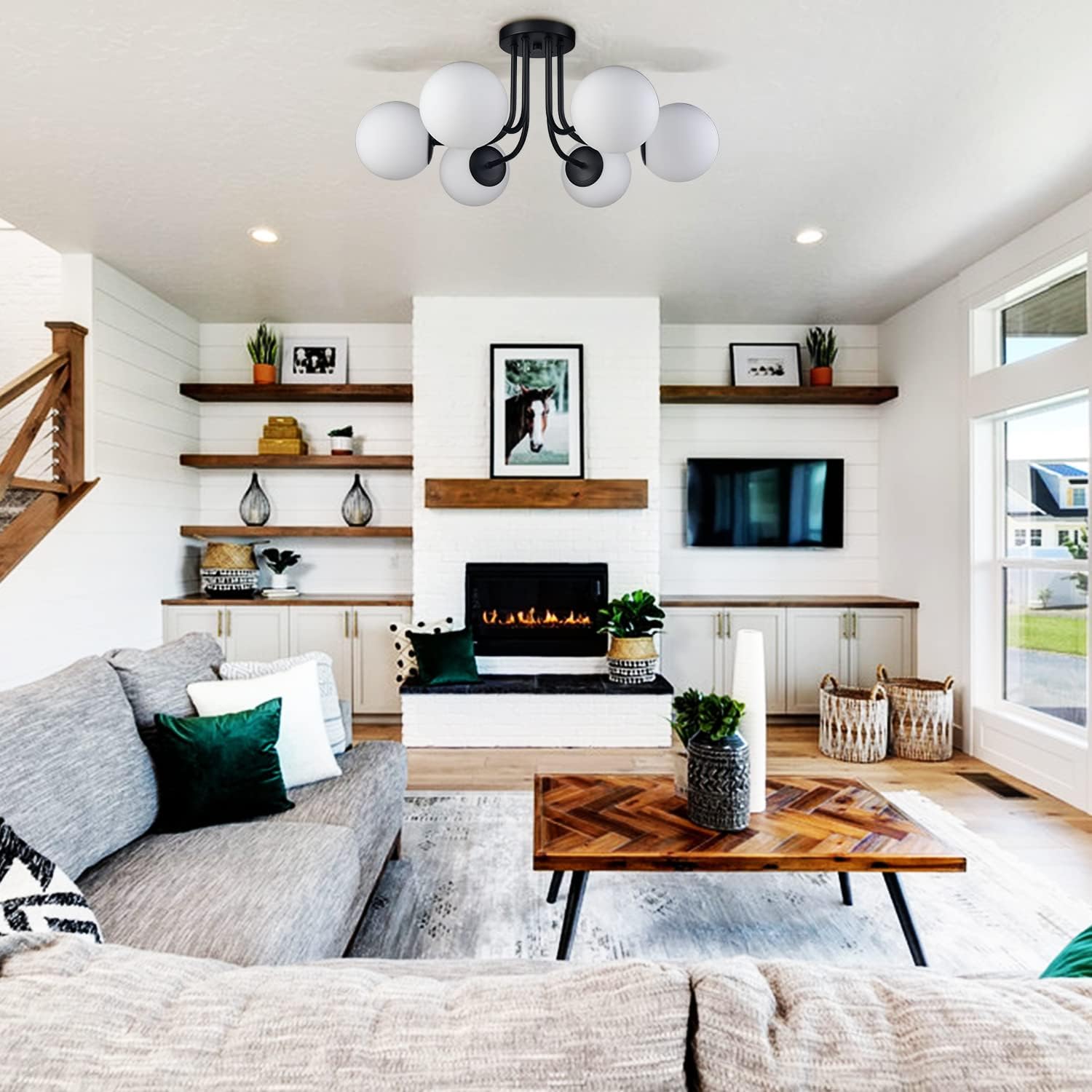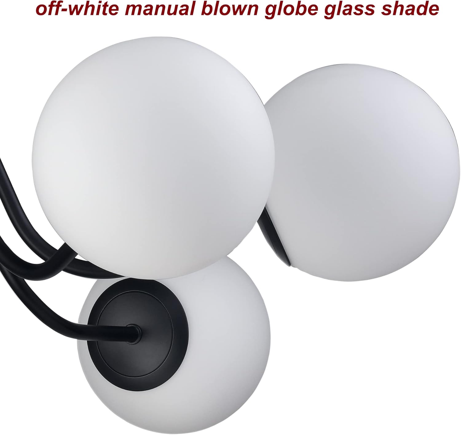 - 6-light matte black semi flush mount ceiling light made of high quality metal,which features 220-degree high-temperature baking varnish craft for strong adhesion.Crafted from globe opal manual blown glass shade,that offering more uniform and soft lighting without shadows.
