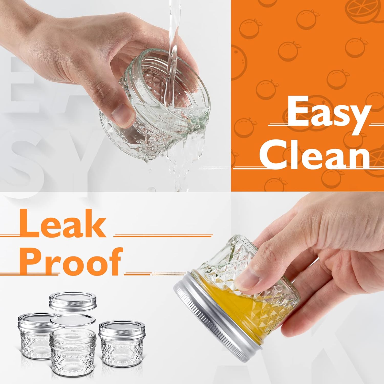 - High Quality Glass Jars: Our 4 oz Glass jars come with 12 reliable lids.Made of durable glass,BPA free food safe grade glass. Diamond pattern design,exquisite appearance.Easy to grip.The jars are clearly visible and perfect for food storage, drinks, canning and fermentation making.Great for a gift set.Durable glass make it last for years.