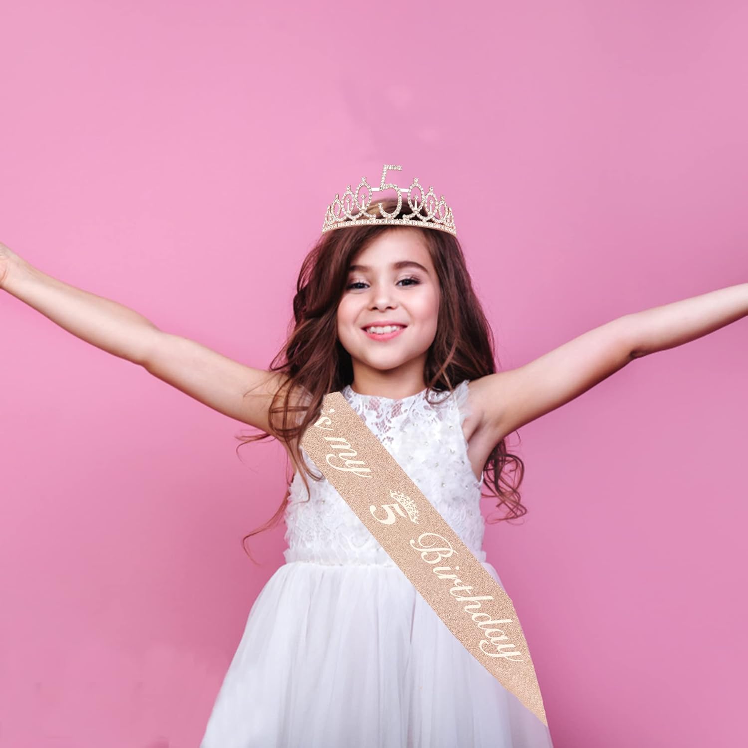 - 【5 Birthday Decorations for Girls】: 5th Birthday Sash for Girls *1pc, Crown for Kids*1pc, Happy 5th Birthday Cake Topper *1pc, Numeral 5 Birthday Candle *1pc