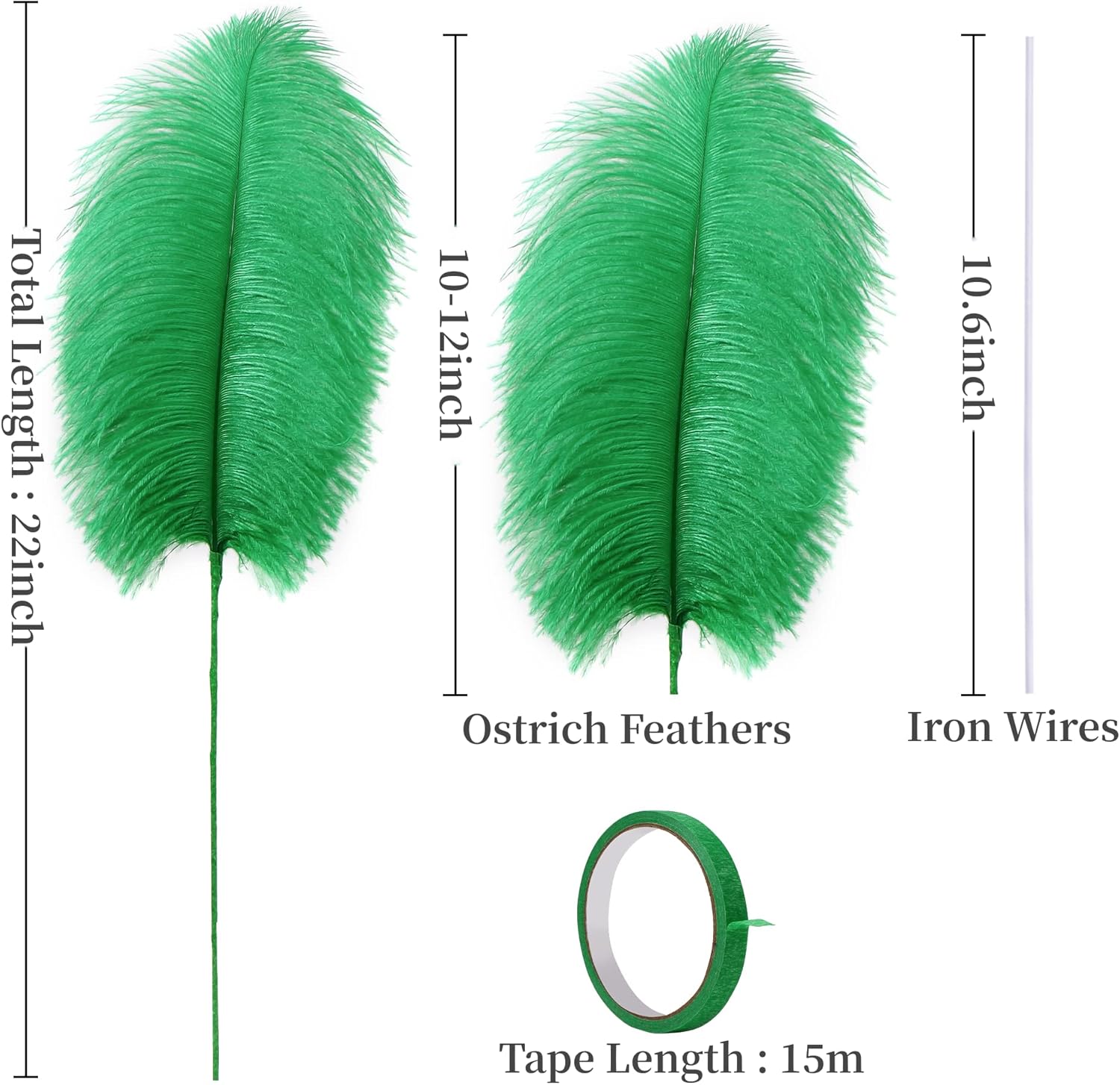 - 22inch Ostrich Feathrs Kit: 20pcs 10-12 inches green ostrich feathers, 20 pcs 10 inches long iron wire, and a 15m tape in the same color with the feather. Rich set content to meet your decoration and use needs