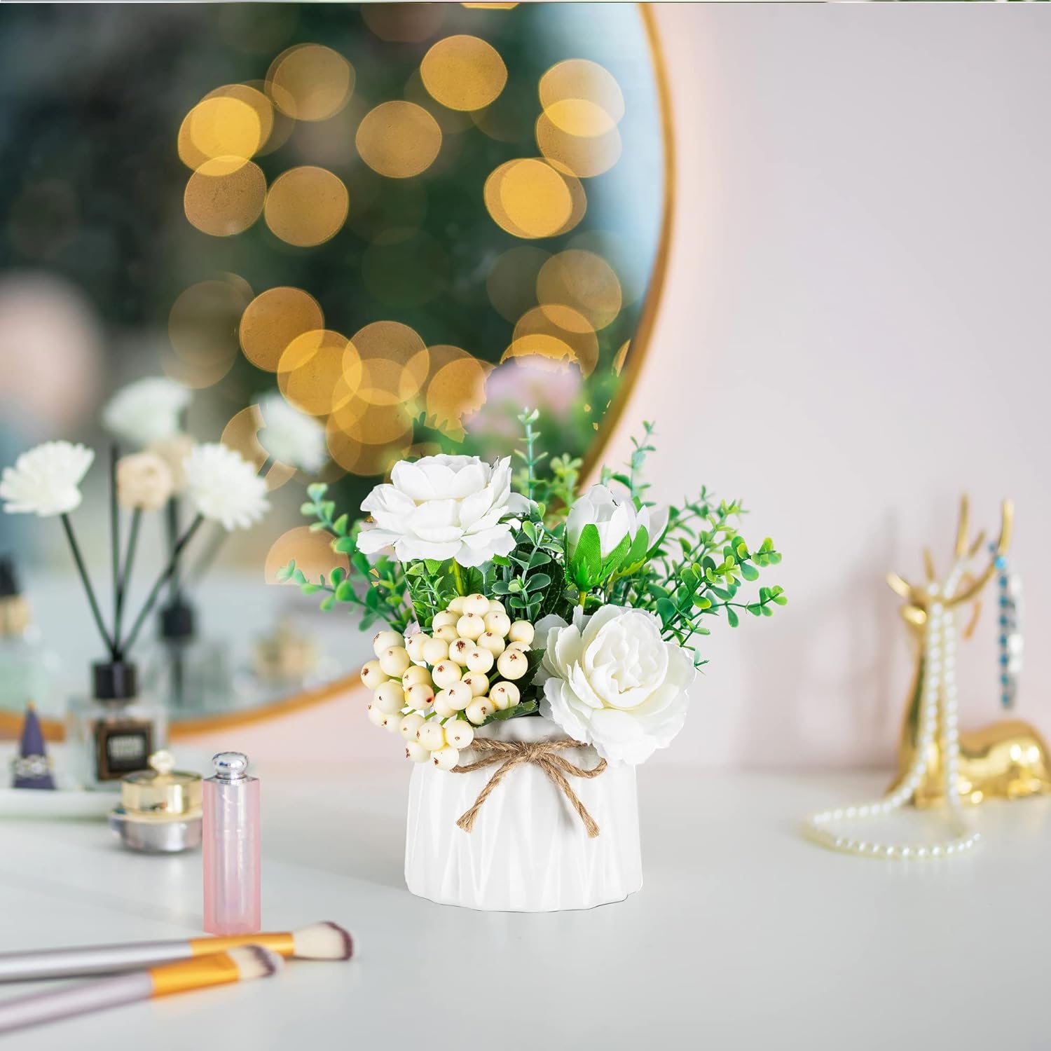 - MULTIPLE DECORATIONS: This is the perfect small floral arrangement to place on any dinning table, office desk,beside table,nightstand, tray display, coffee table and any shelf, or playing as dresser decor, mantel decorations and entryway table decor,bringing a lot of freshness to any space. It is also a ideal choice as kitchen decor for counter and table decorations for dining room.