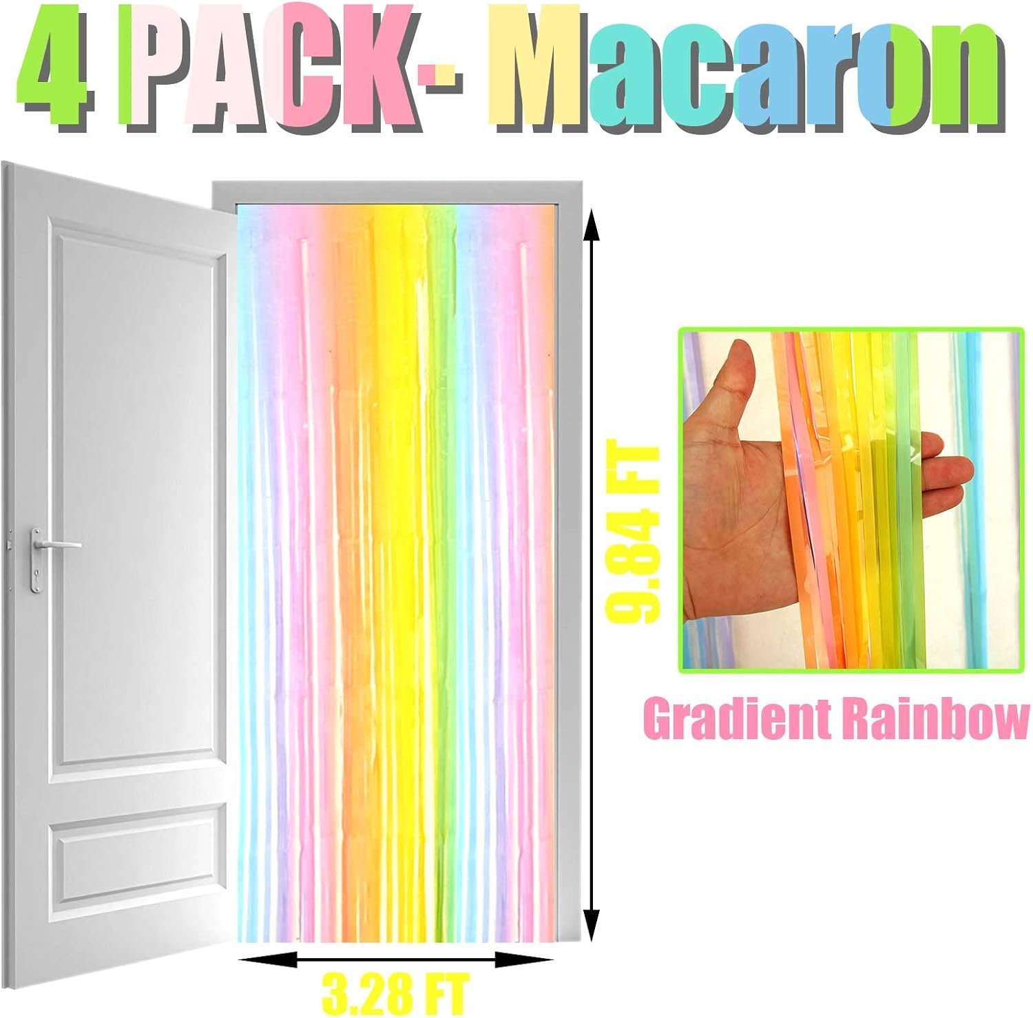- The size of each foil fringe curtain is 3.2 feet wide and 9.84 feet long, Package include 4 pack foil fringe curtains, suitable for hanging on a door or coverage a wall fully.