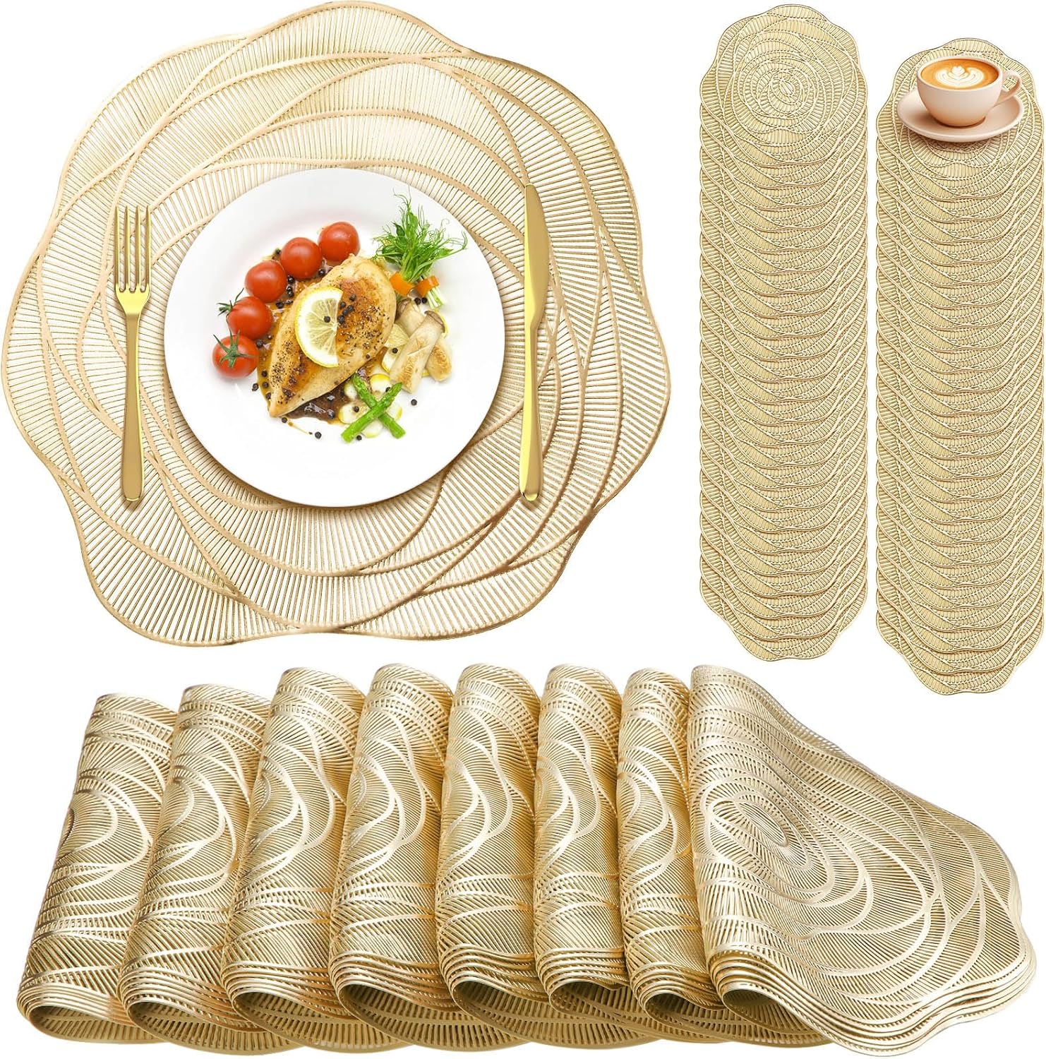 Sieral 48 Set 15 Inch Round Pressed Vinyl Placemats Hollow Out Rose Placemat Set Metallic Slip Resistant Place Mat Coaster Including Place Mats and Coasters for Wedding Dining Kitchen (Gold)