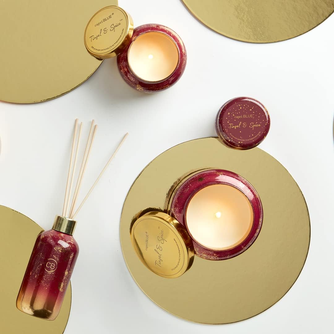 Capri Blue Glimmer Jar Candles - Luxury Holiday Scented Candles for Home - Long Lasting Soy Wax Blend - Scented Holiday & Home Decor - Tinsel & Spice Signature Petite Jar (8 oz)