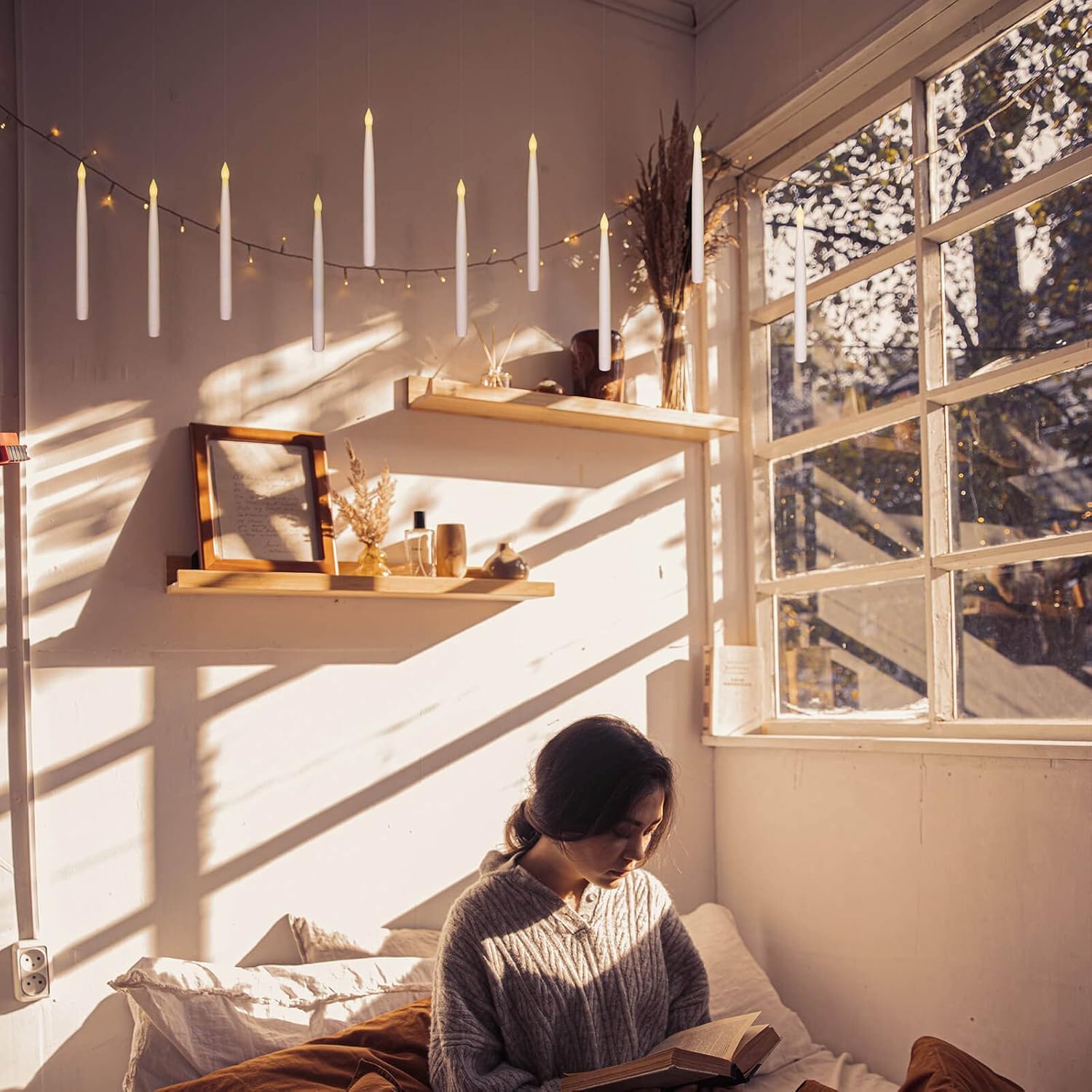 - Indoor decorations: The LED candle flickers with warm white light. You can hang these candles on the ceiling or chandelier to create "floating" candles effect for a Movie Theme party. They work great for dinner table, room, bedroom, classroom, nursery, birthday party, wedding. Also a perfect gift for Halloween Christmas and valentine's day.