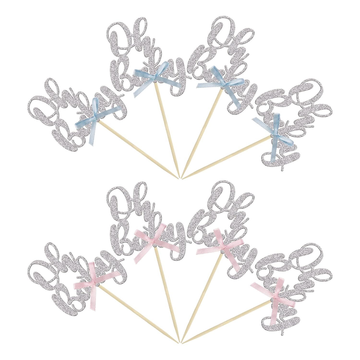 - ๐๐Premium Material: These Silver Oh Baby with Bowknot Cupcake Toppers are made of 300 gram glitter card stock and food-grade toothpick, very safe to put them on cakes, cupcakes, ice cream, fruits, pie, dessert, cheese or any dish and food appetizer you want to decorate.