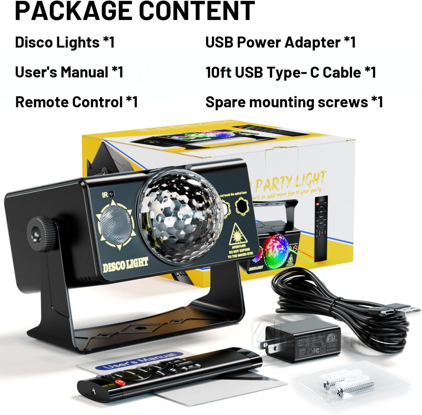 - đ Easy to useđ Party lights dj disco lights plug-and-play, with carrying handle and carrying screws, can be placed on the table, mounted on the ceiling, wall, comes with a 2-meter adapter for 110V-220V and a 3-meter USB cable.