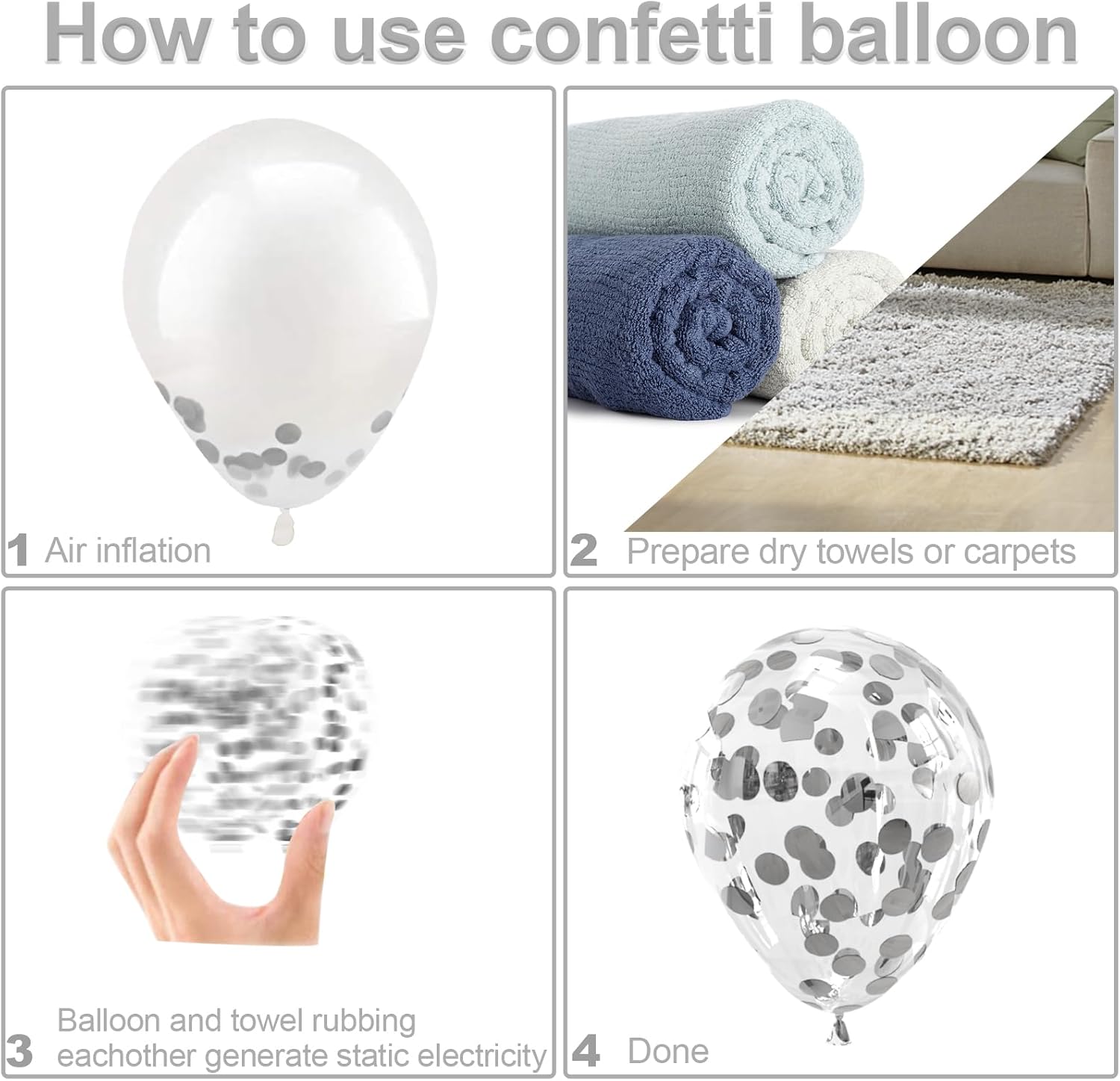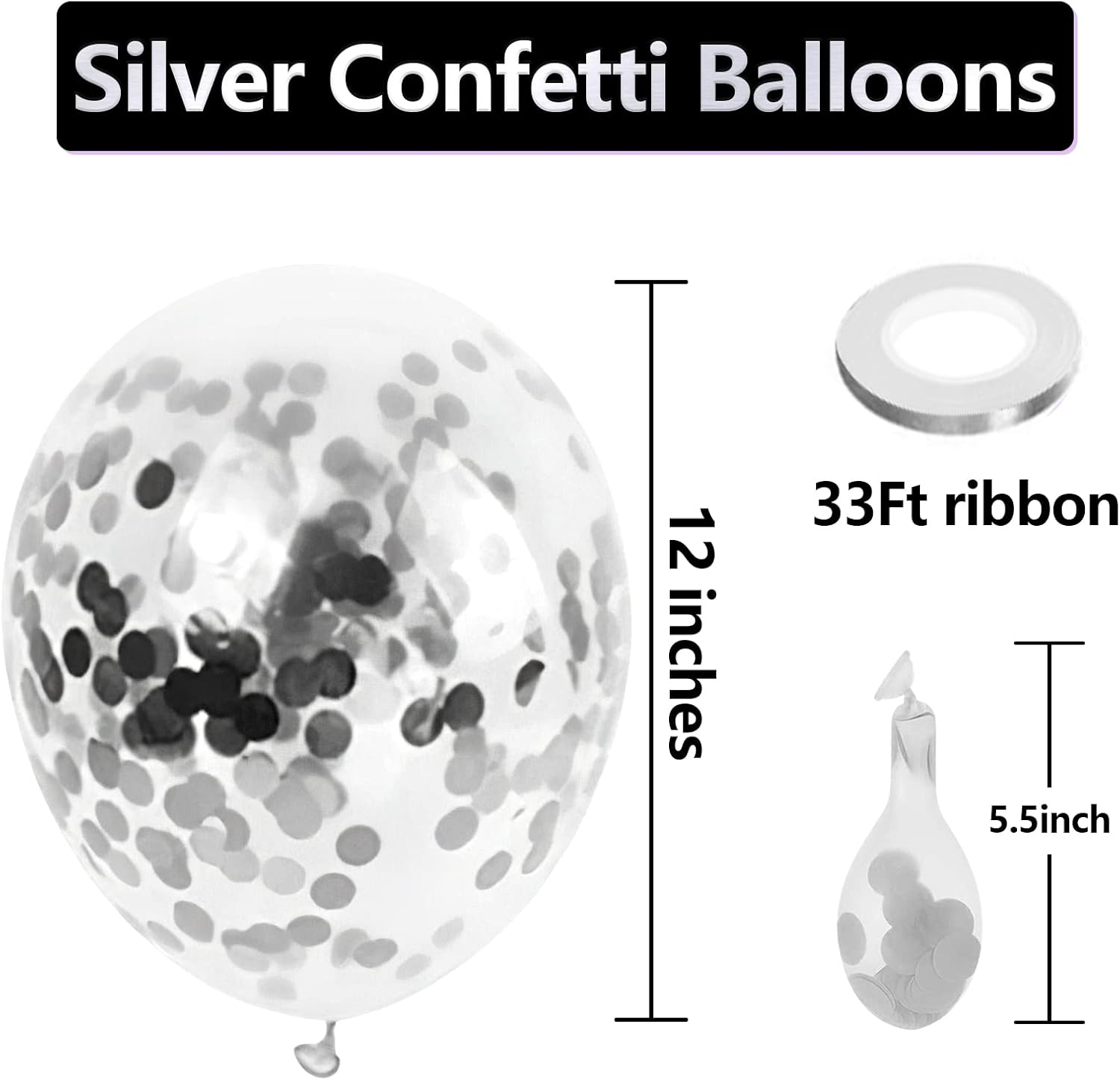 - ăSilver Confetti Balloonsă- Each sets contains 60pcs silver confetti balloons of 12 inches and 1pcs silver ribbon (33 feet total).The right amount quantity and most suitable color for each party decoration.