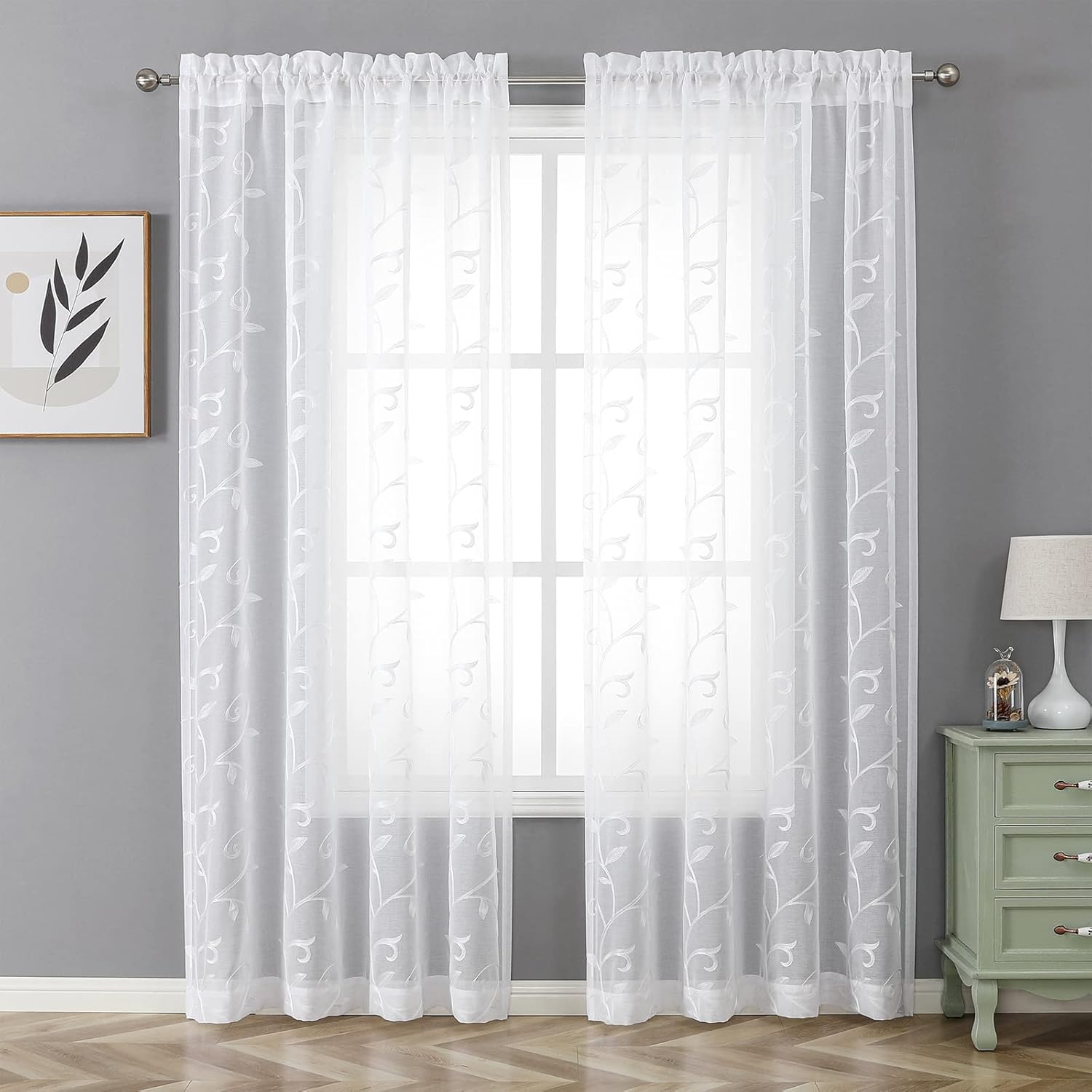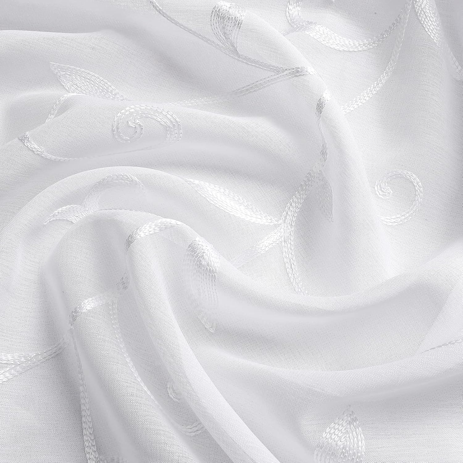 VISIONTEX White Leaves Sheer Voile Curtains, Decorative Embroidery Rod Pocket Window Drapes for Home Living Room and Bedroom 54 x 95 Inch, Set of 2 Curtain Panels