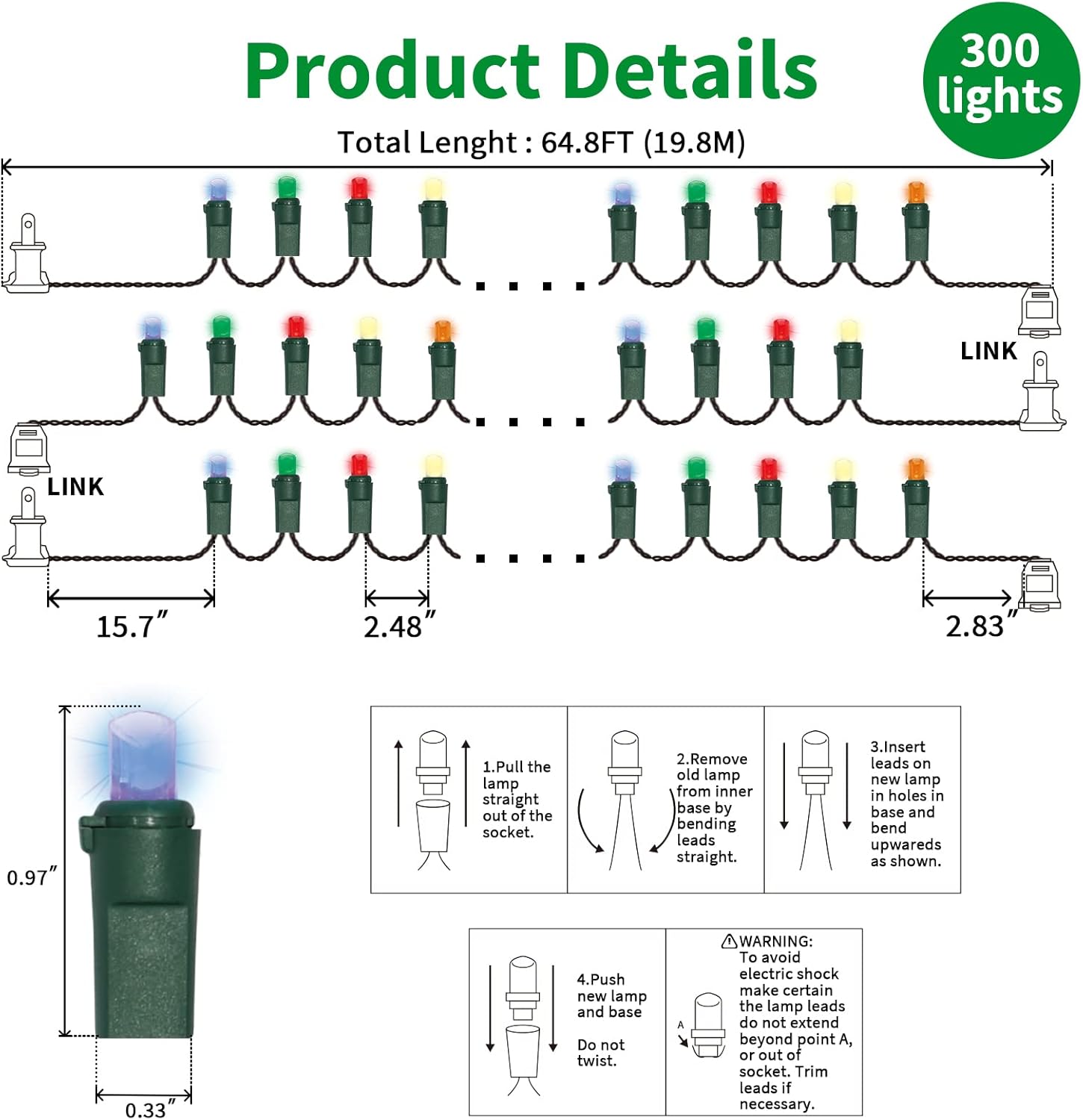 Multicolor Wide Angle LED Christmas Lights, 64.8 Ft 300 Count, Pack of 3 Strands 21.9 Ft 100 Lights UL Certified Commercial Grade Green Wire 5mm Holiday String Light