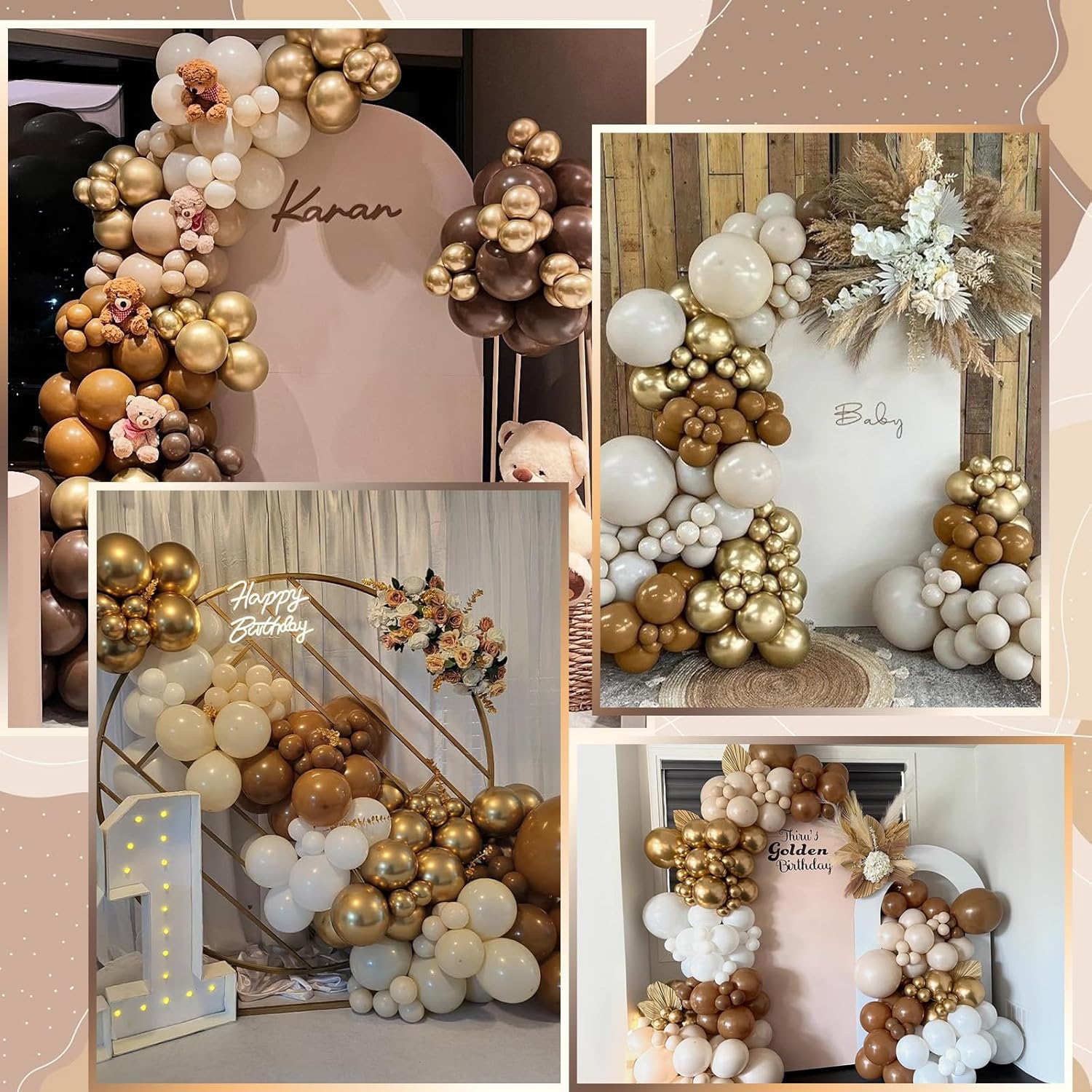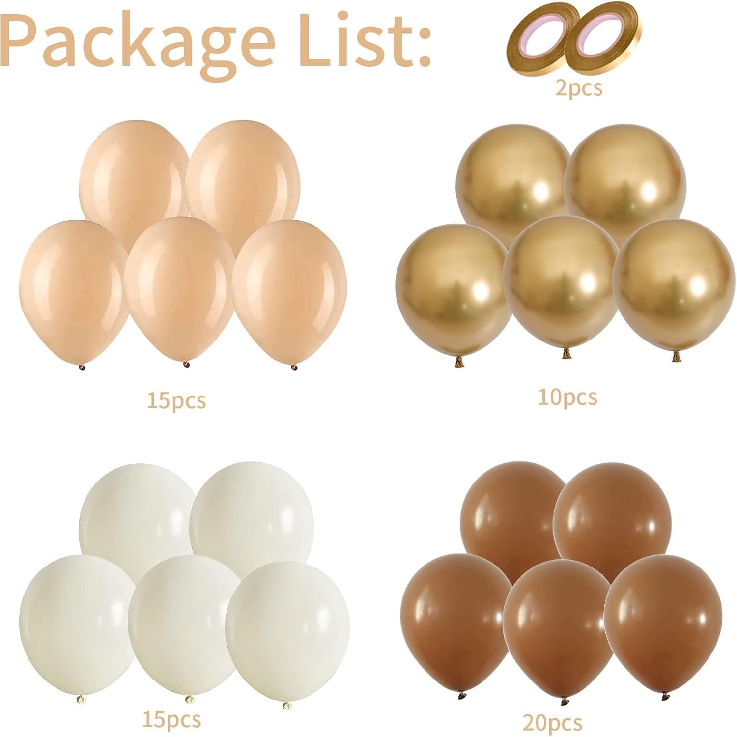 - Brown Apricot Balloon: Set includes Sand White, Brown, Metallic Gold and Apricot. Neutral colors balloons can be applied to any party, birthday party, baby shower party, graduation party, bear theme party, jungle party, etc. It will be a good photo backdrop.