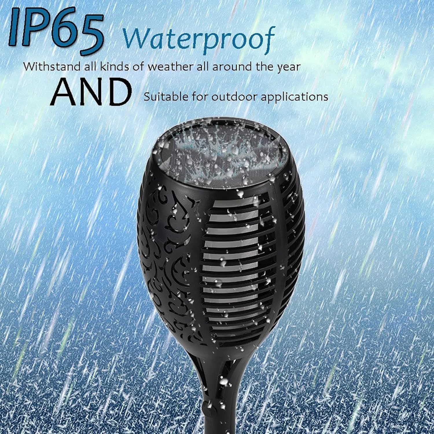 - AUTO ON/OFF: The solar torches lights work dusk to dawn. They can work 10-12 hours in summer and 5-8 hours in winter after fully charged. They are weatherproof and withstand all weather conditions, such as snow ,raining, thunder and lightning