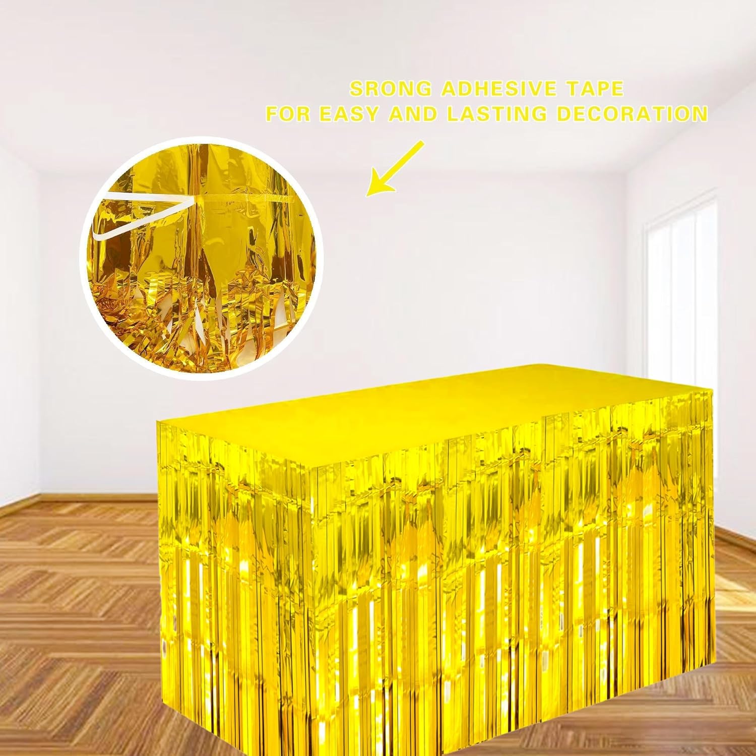 - 【RELIABLE SHINY FOIL TABLE SKIRT】Metallic tassel table skirt are made of aluminum foil with sequins, making the foil table skirt more shiny and beautiful, making the party more complete! They can stay stuck on very well, with smooth surface, great for your party venue decoration
