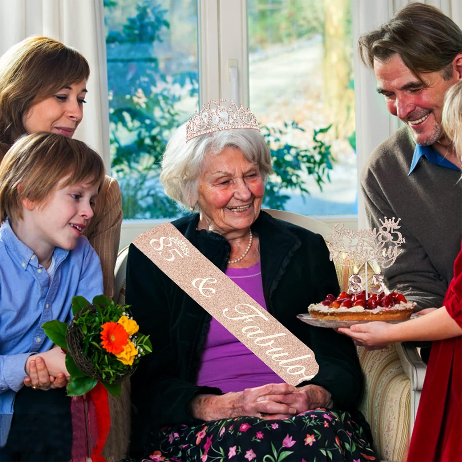 - 85th Birthday Gifts for Women: Birthday Sash for Women *1pc,Women Birthday Crown*1pc, Happy 85th Birthday Cake Topper *1pc, 8+5 Birthday Candles *1set.