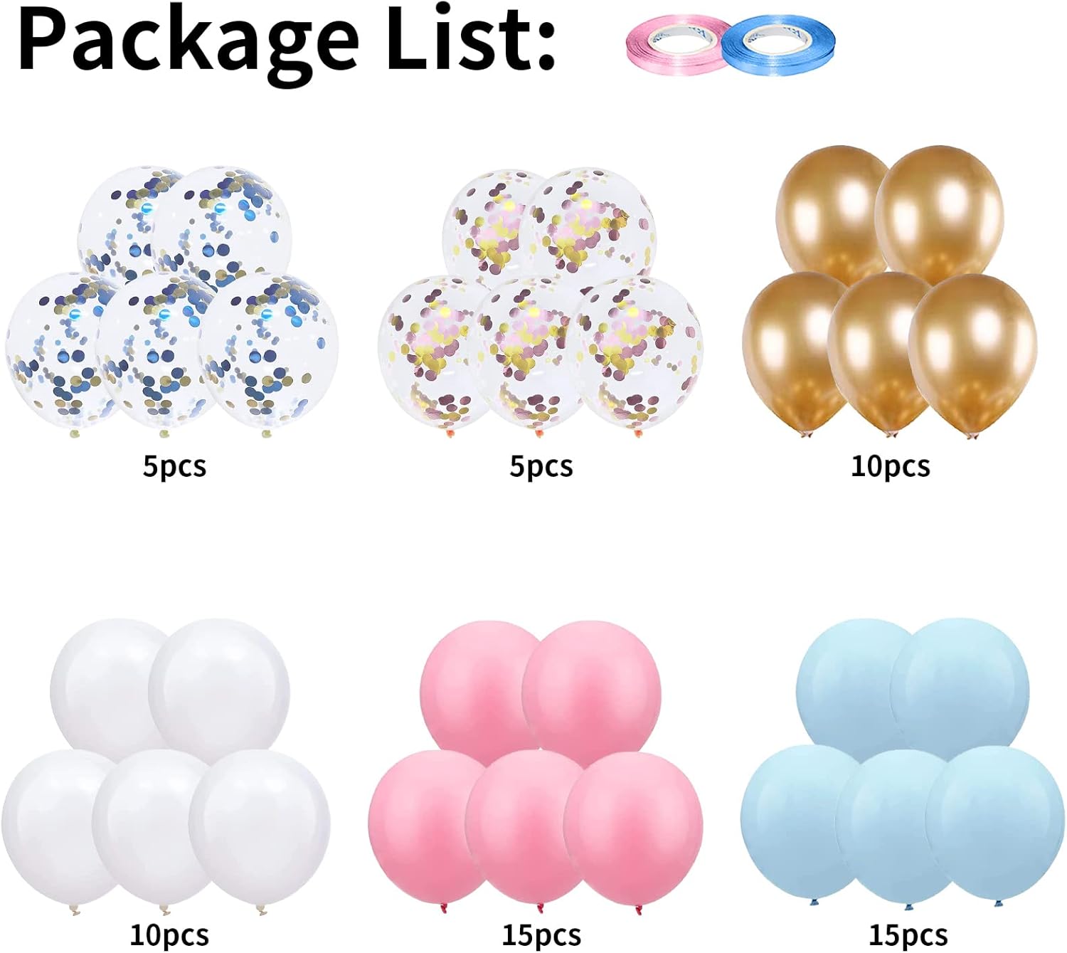 - Pink Blue Balloons Set: 60 balloons and 2 ribbons. All our party balloons are shipped in vacuum packaging to prevent them from being oxidized during transportation.