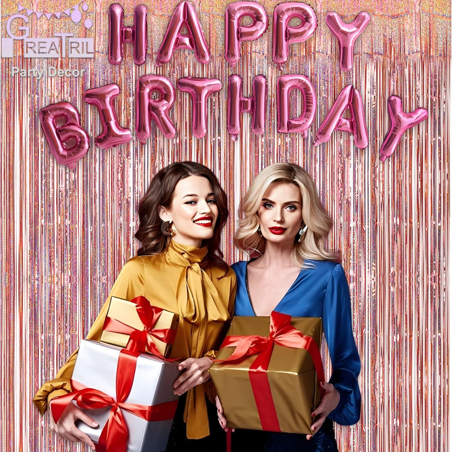 - Tips: You can match other decorations, such as rose gold foil fringe curtains with rose gold red tinsel curtain, rose gold banner or happy birthdays banner, etc. We believe this combination will definitely create a very beautiful party.