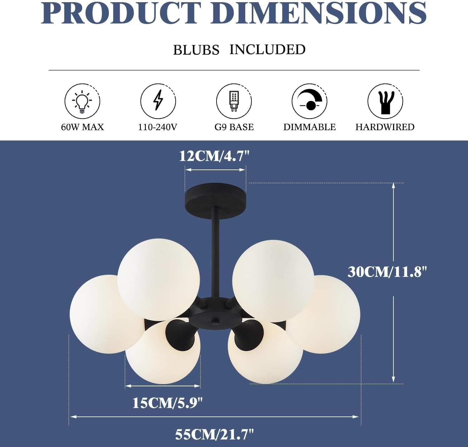 - G9 Base: This black metal semi flush mount ceiling light is compatible with G9 socket bulbs, whether they are energy efficient LED bulbs or vintage incandescent bulbs, they can be easily adapted. The ceiling light fixture 6 lights itself is not dimmable, but it can be fully dimmable when used with dimmable bulbs and a compatible dimmable switch. You can choose different color temperature and brightness bulbs according to different occasions to customize your lighting environment (Bulbs and dimmable switch not included)