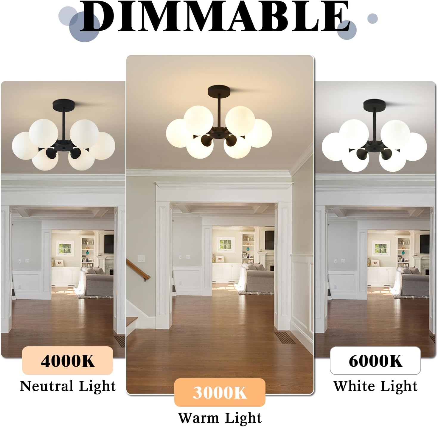 - Black and White Color Scheme: This globe flush mount ceiling light stands out with its minimalist yet stylish design. The smooth black metal lamp body shows the hard texture of industrial style; with 6 rounded frosted white glass globe shades, it is soft and cozy, injecting the artistic atmosphere into the space. Whether it is a modern and simple living room or a warm and comfortable dining room, it can be perfectly adapted to become the visual focus of the space