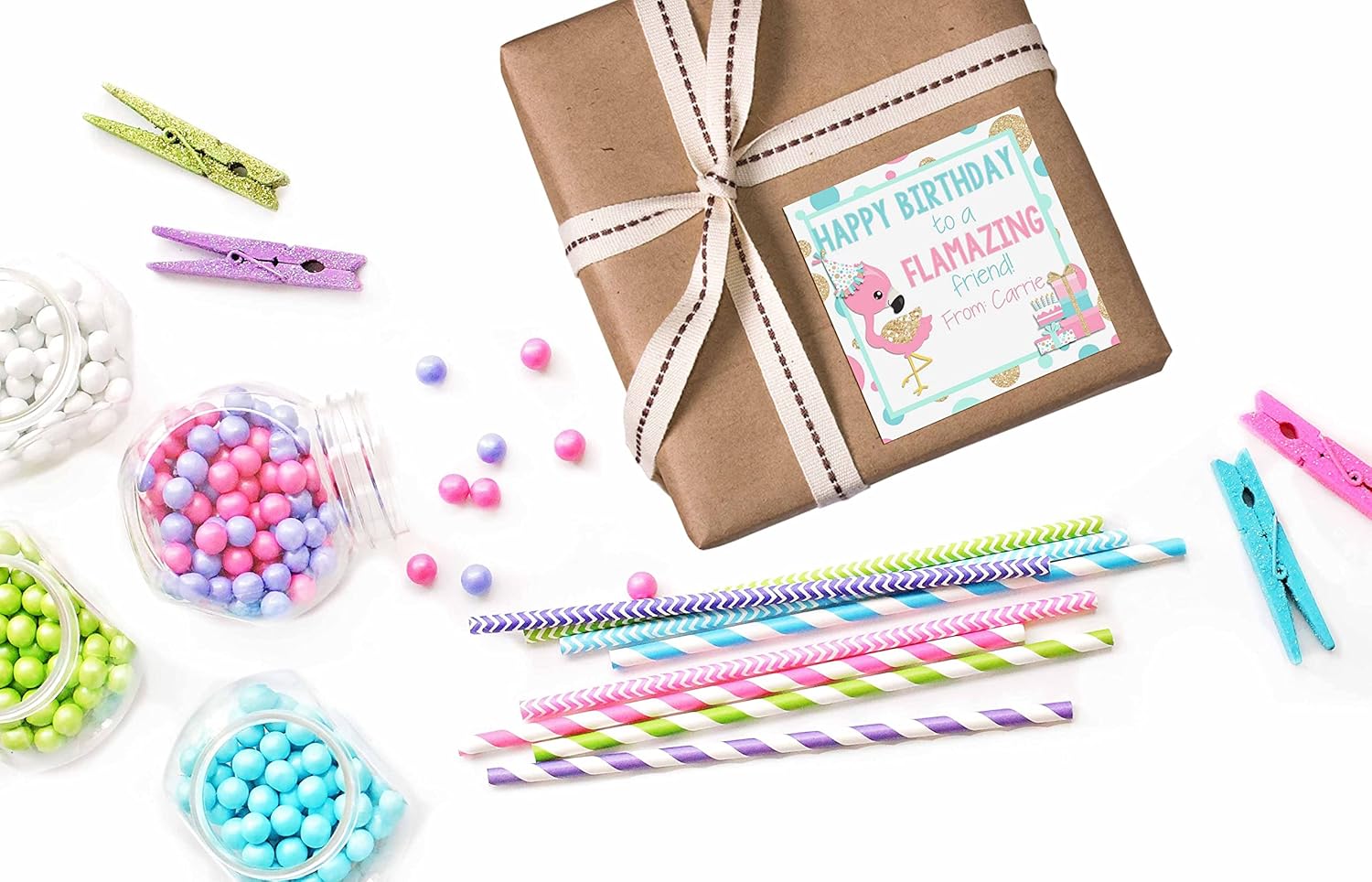 Custom & Personalized FLAMAZING Flamingo Happy Birthday Gift Tag Sticker Labels, 24 2.5" Square Stickers by Amanda Creation