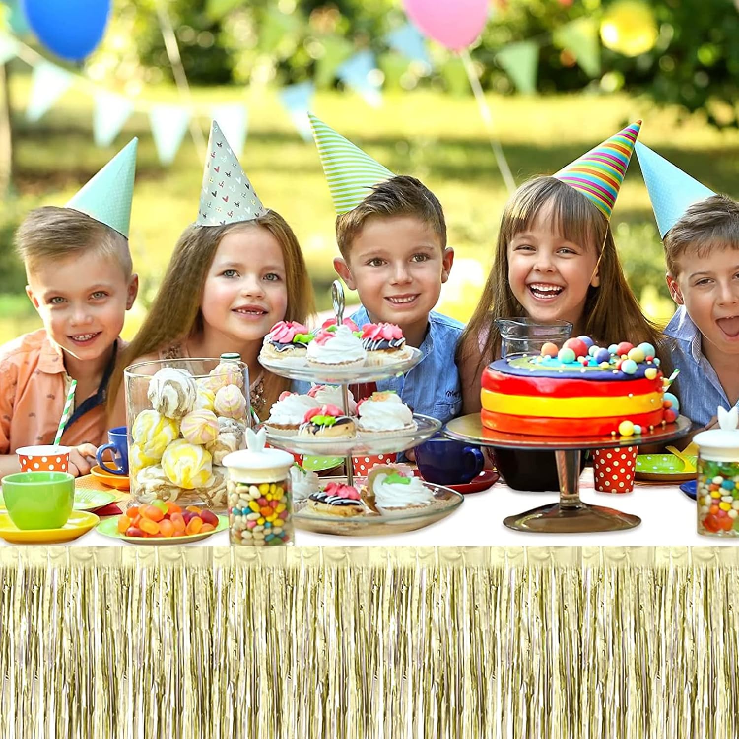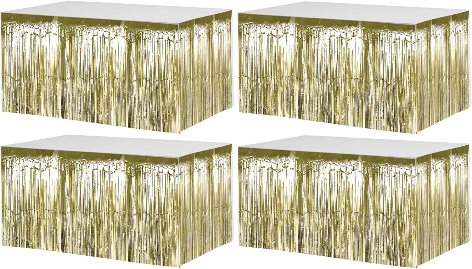 4 Pack 29x108 Inch Metallic Foil Fringe Tinsel Table Skirts for Rectangle Tables Streamer Backdrop for Wedding, Birthday, Parade Floats, Christmas, Halloween Party Decoration(Light Gold)