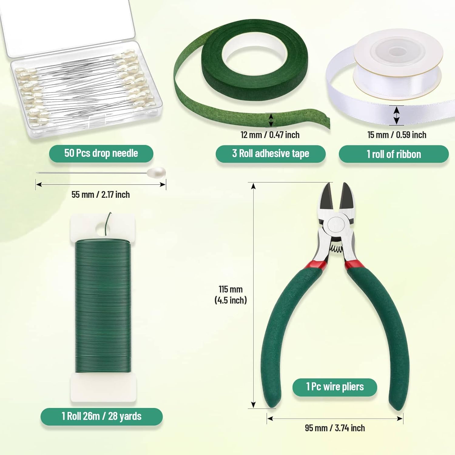 - FLORAL TAPE AND WIRE ARRANGEMENT KIT INCLUDED β 114 feet green paddle wire 22 gauge, 3 rolls dark green floral tape, 50pcs corsage boutonniere pins, 1 roll of 5/8" wide satin white ribbon and 1 pair wire cutter. These bouquets making supplies are all you need for DIY flower arrangements, bouquets, and boutonnieres etc.