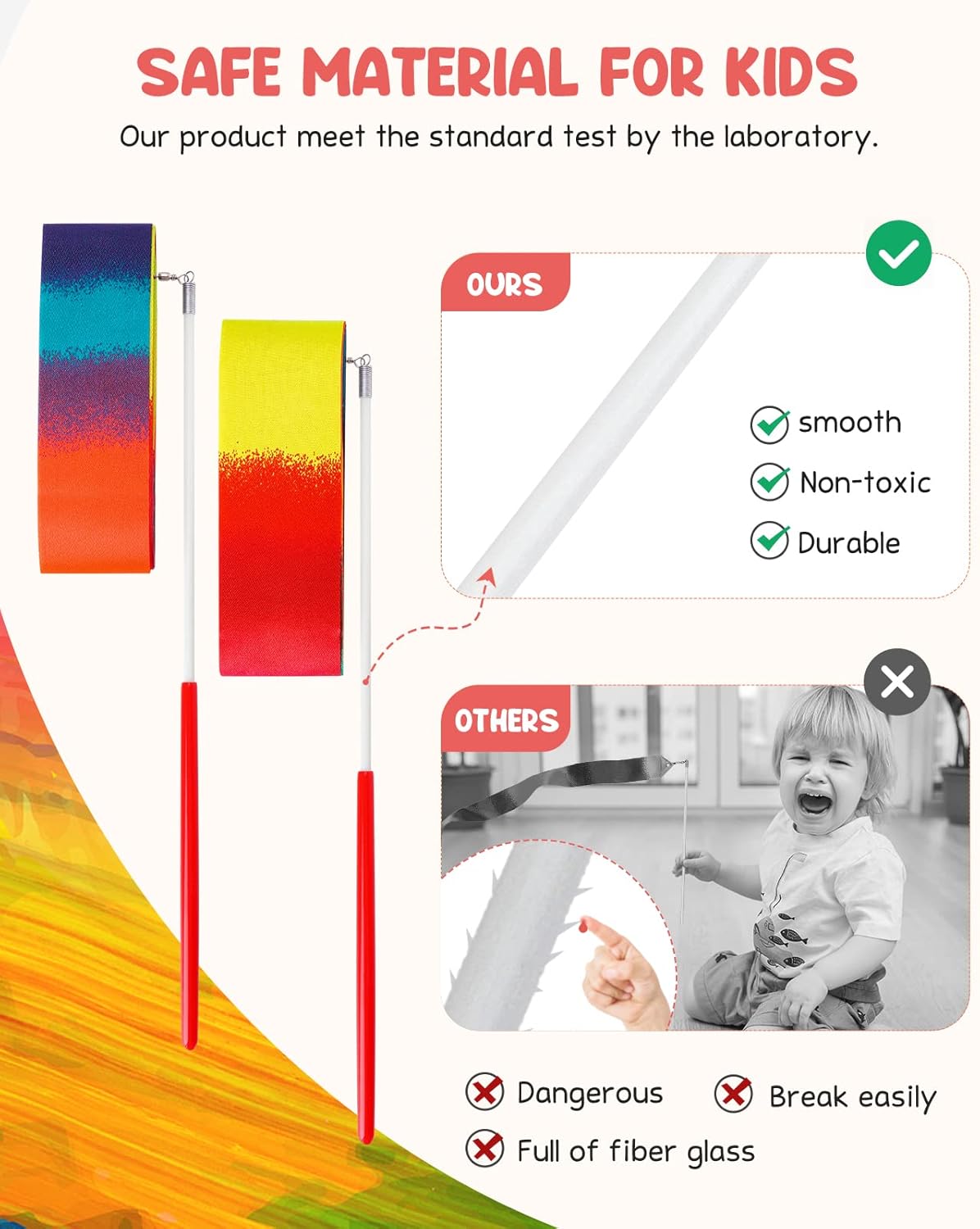 - Upgraded Material:Meet the standard test by the laboratory,the Joycat dance ribbon streamers can be used by kids without worry.The gymnastics ribbon is made of high-quality silk and red plastic coating handle,which is smooth,non-toxic and high quality