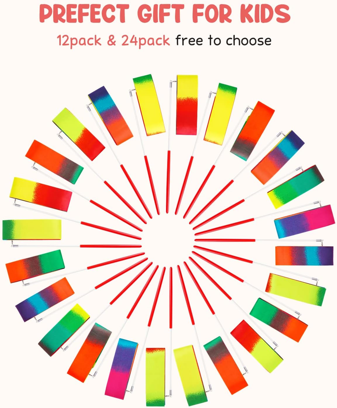 - Package included:Each package contains 12 dancing ribbons of multicolors. The Ribbon length 200 cm/78.7 inches and the sticks length: 30.5cm/12 inches,which is enough for kids and adults to dance