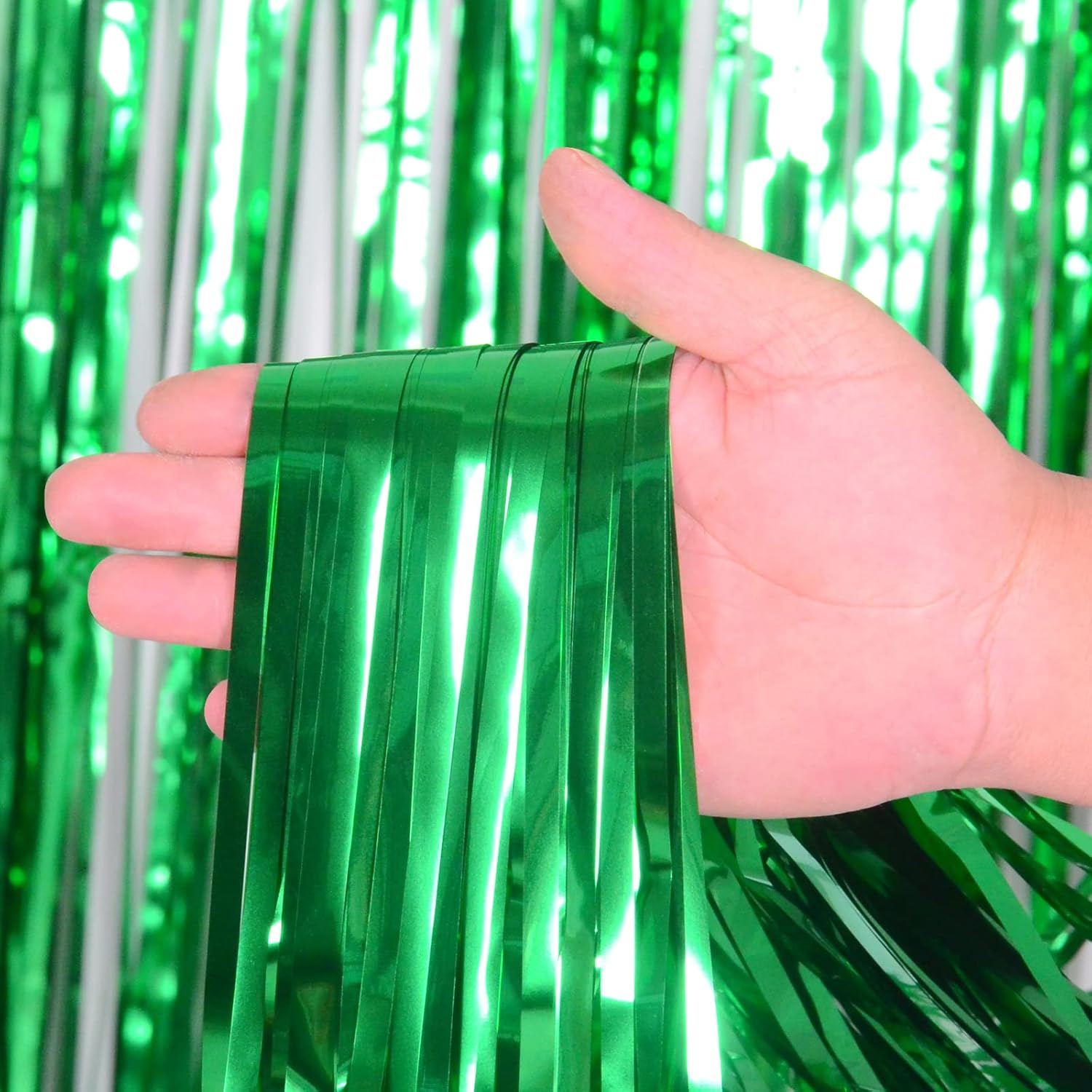 - Value Pack of 2: Includes 2 packs green foil fringe curtains, enough to decorate your party backdrop and save your money. Each curtain is 3.2ft x 8ft. You can use 2 packs of the curtains side by side to make the backdrop larger, or overlap 2 pack of curtains to achieve a fuller and better look.