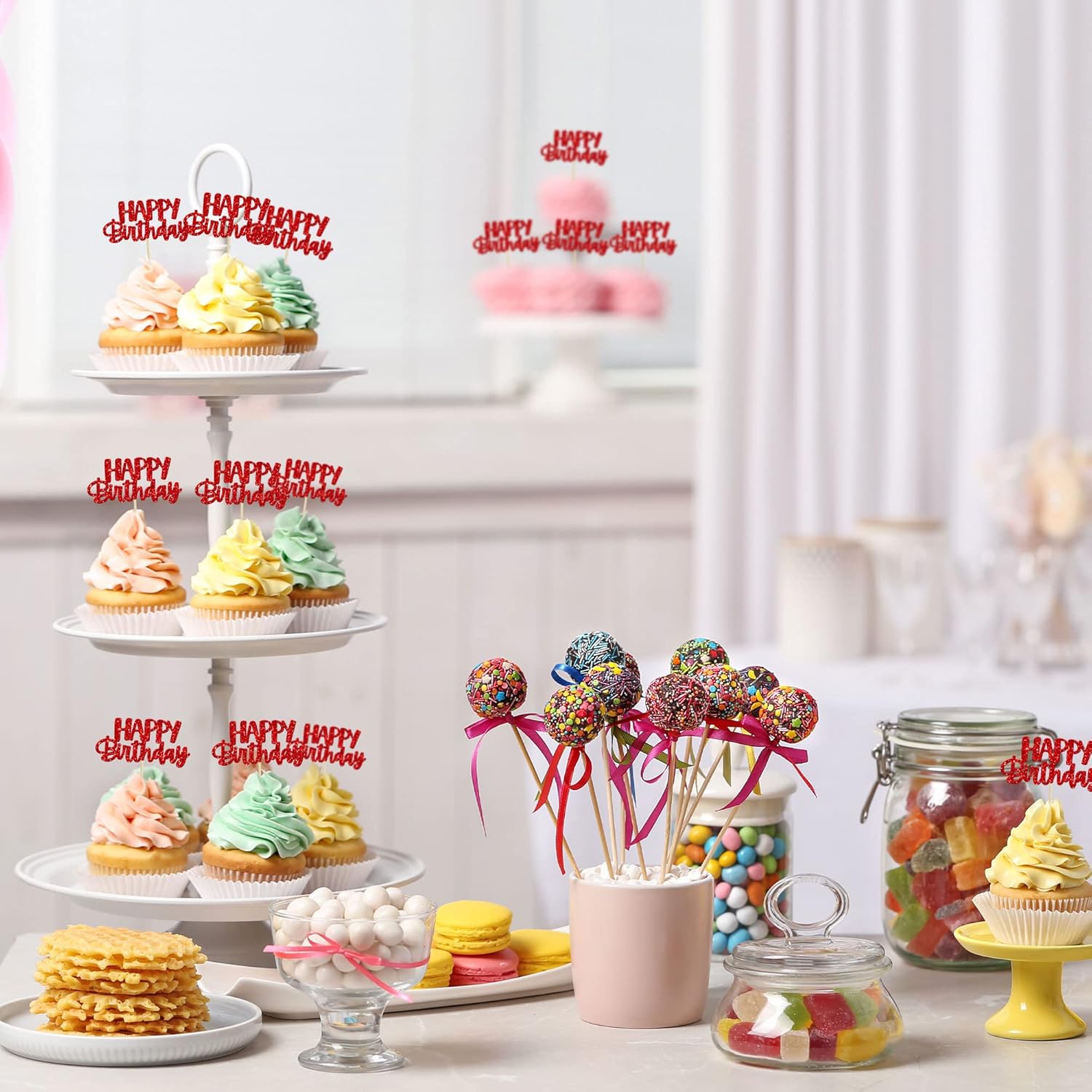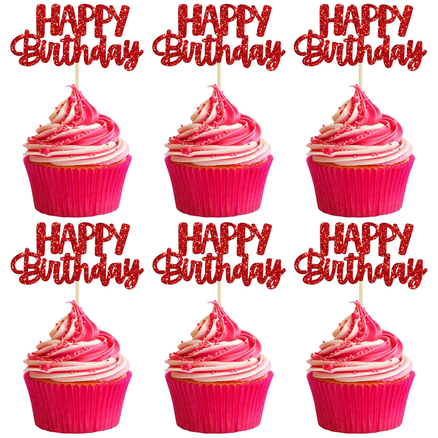Gyufise 24pcs Happy Birthday Cupcake Toppers - Glitter Cupcake Food Picks for Celebrating Theme Party Cake Decorations - Red