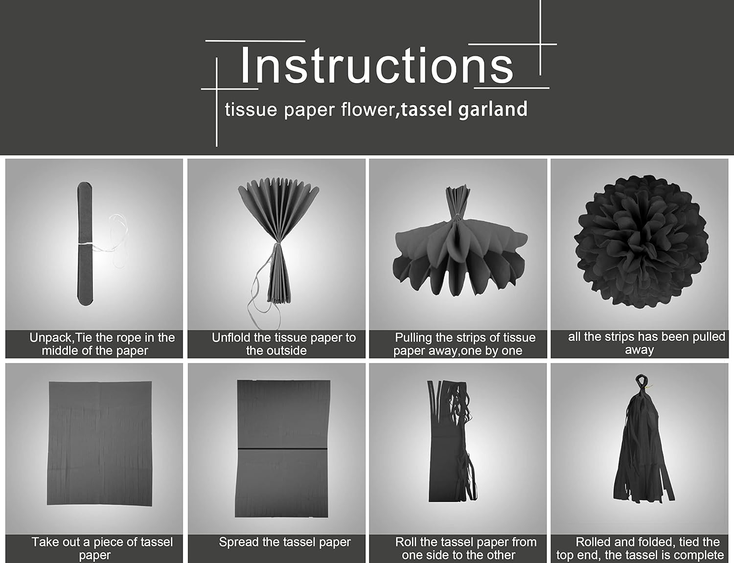 - 【Package Contains】The decoration kit include 6pcs tissue paper pom poms,15pcs tissue paper tassle garland,1pcs flag banner,1pcs party streamers.all come in 3 color of Red Black and White.