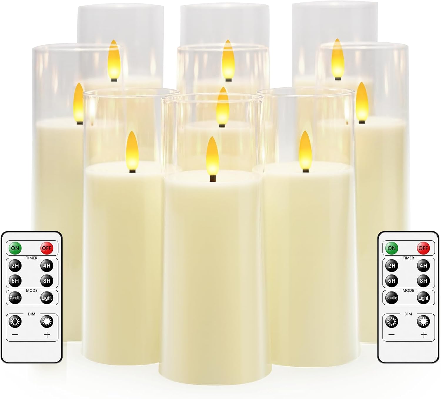 Flickering Flameless Candles Battery Operated with Remote and 2/4/6/8 H Timer Plexiglass Led Pillar Candles Pack of 9 (D2.3"xH 6"7"8")with Realistic Moving Wick Candles for Home Decor(Ivory)