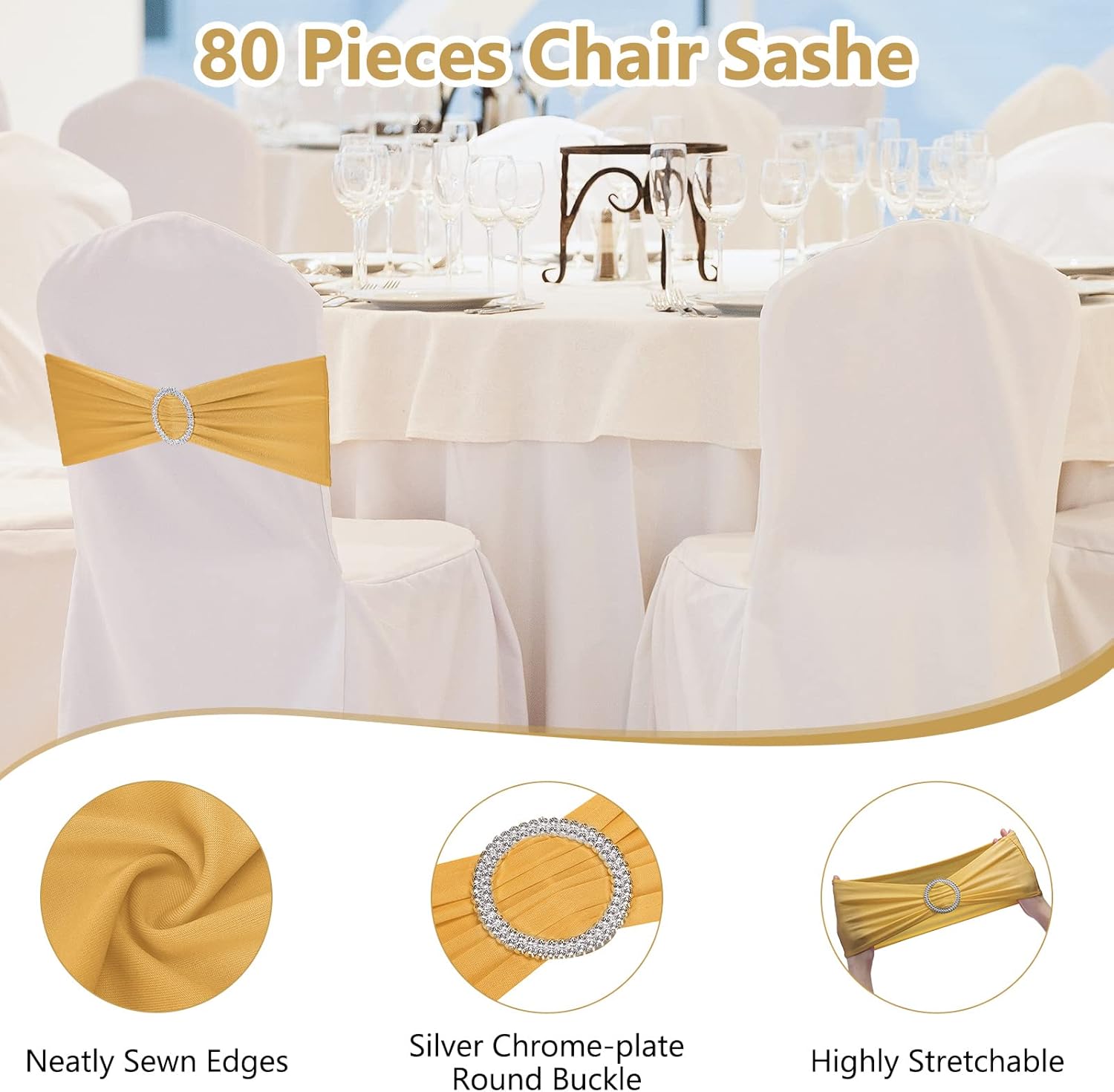 CHENGU 150 Pieces Spandex Stretch Chair Sashes Bows Elastic Chair Cover Bands Ties with Buckle Slider for Wedding Party Reception Events Universal Ceremony Banquet Decorations(Gold)