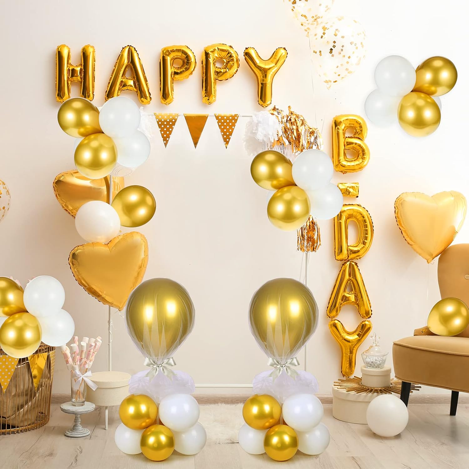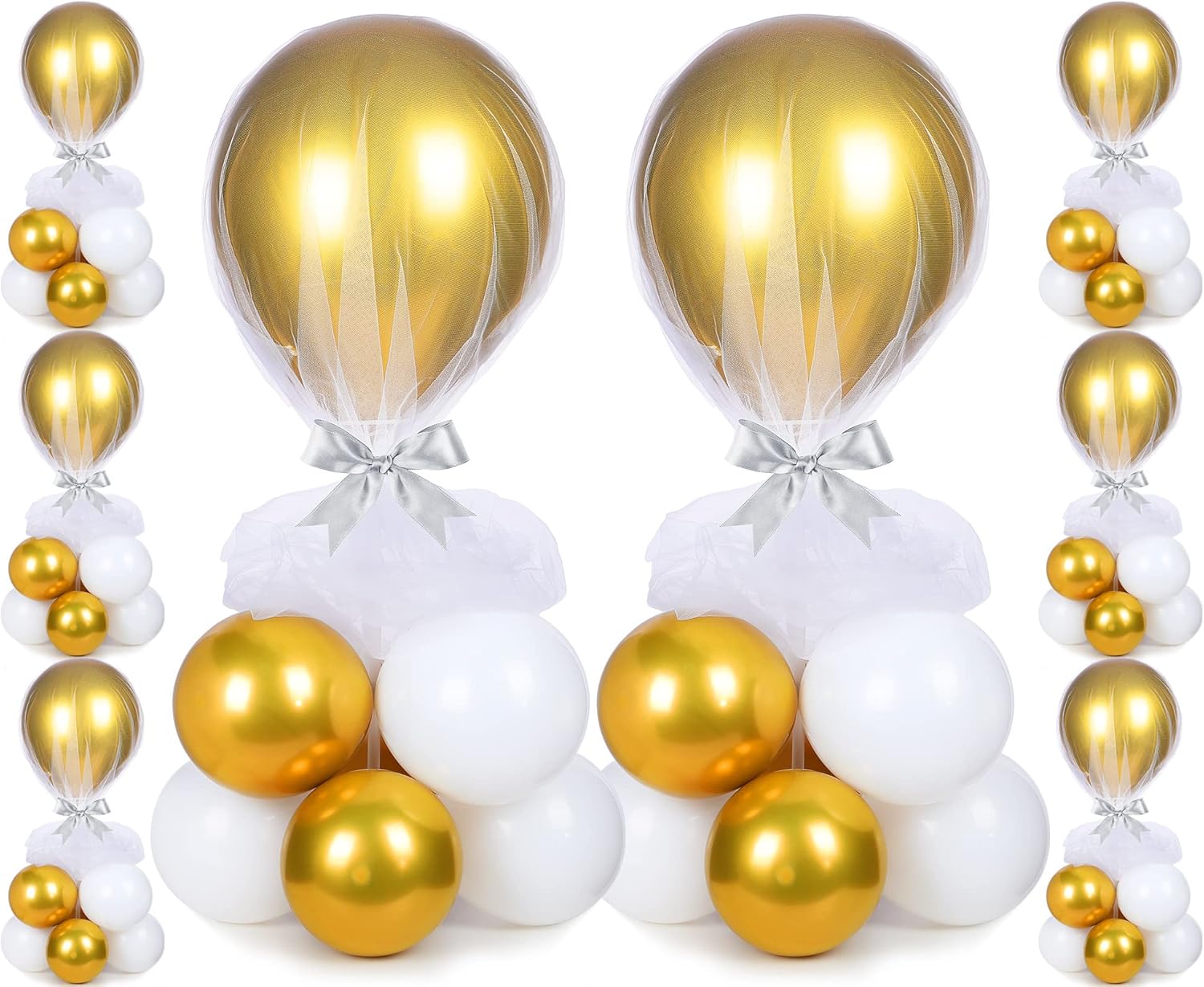 - What You Get: you'll receive a nice value balloon pack that includes 8 reusable tabletop balloon sticks, 8 balloon flower bases, 16 round snaps, 8 white gauze covers, 8 balloon fixed holders, 72 pieces of 5 inch latex balloons (36 white and 36 gold), 8 pieces of 12 inch gold latex balloons and 8 pieces white thick ribbons
