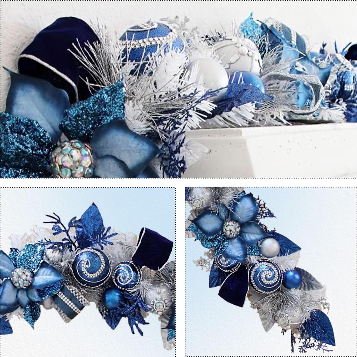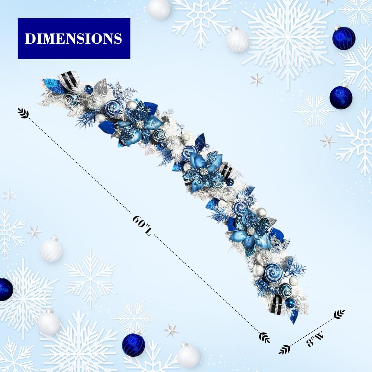 - 5 ft Christmas Garland For Mantle Unlit Garland For Stairs Railing, Banister, Staircase, Fireplace, For Table No Light, Garland Decor Frosted Red Poinsettia Holiday Tree (Lux Blue Silver)