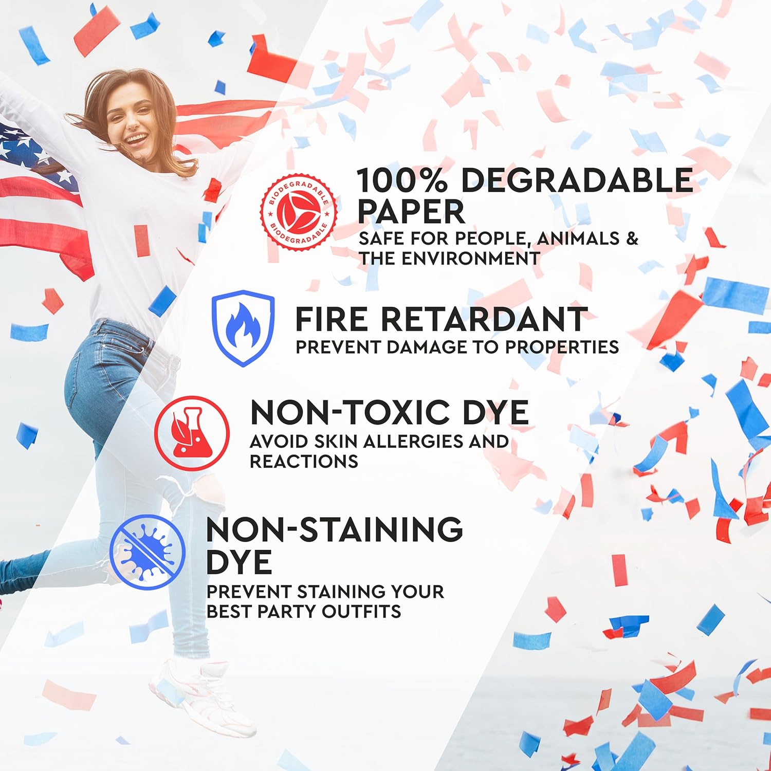 - π RED WHITE & BLUE CONFETTI - 100% BIODEGRADABLE - Confetti are made of lightweight fire resistant papers, 100% biodegradable. Color dye is non-toxic and won't rub onto your clothing. 100% safe for your party and good for the environment.
