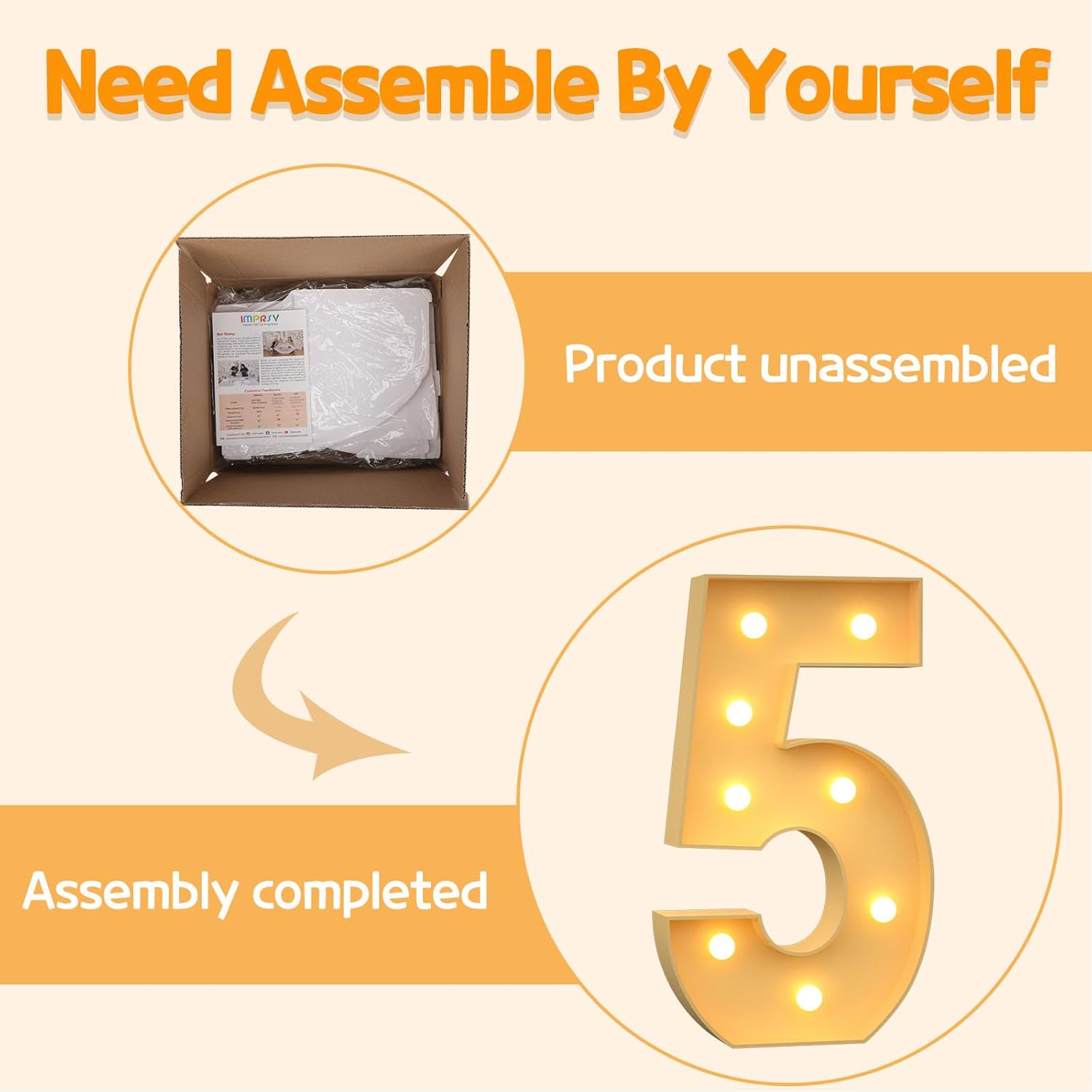 - Assembly Required: Our large marquee numbers is made from foam board and easy to assemble with our splicing mode. Just follow the numbered instructions to align and insert the bottom plate, and reinforce it with a hot glue gun. Then, you're done!