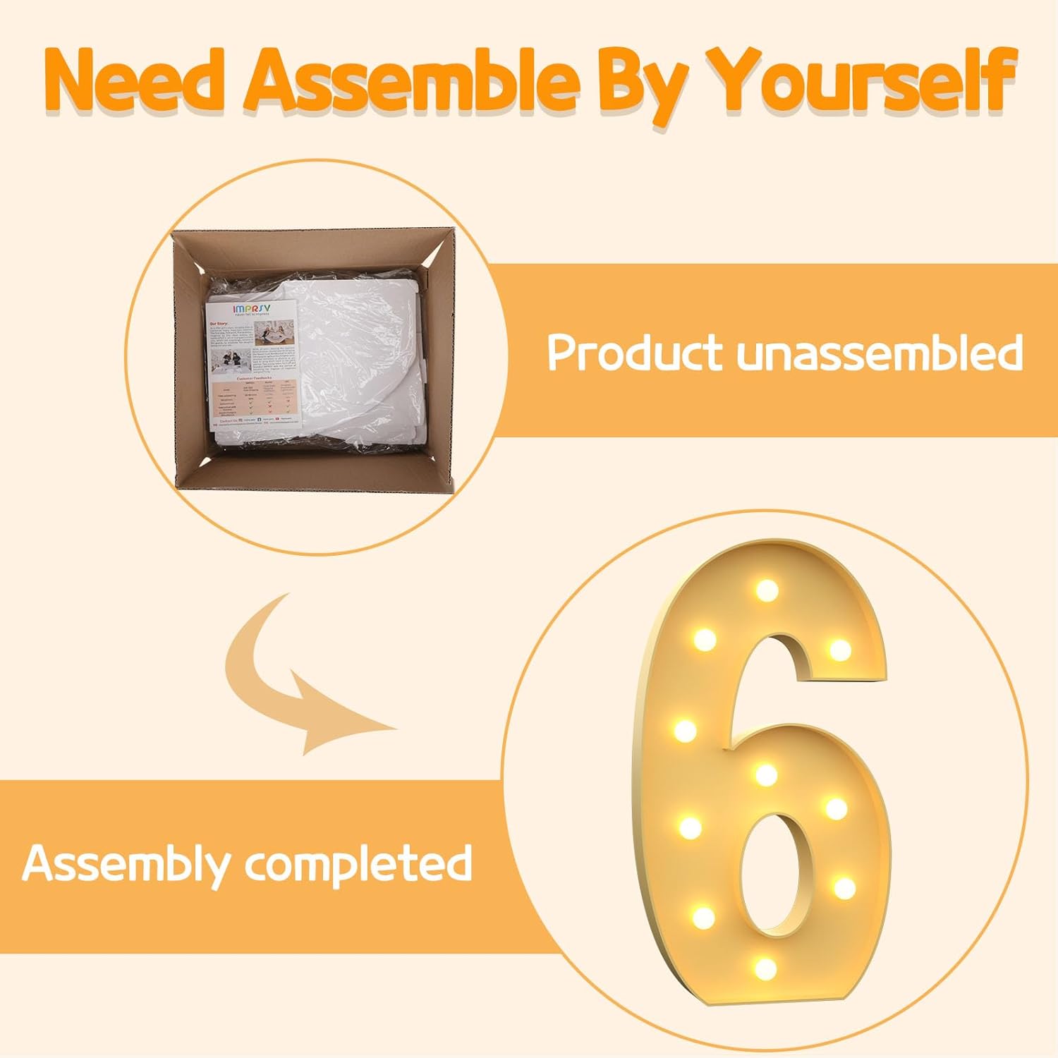 - Assembly Required: Our large marquee numbers is made from foam board and easy to assemble with our splicing mode. Just follow the numbered instructions to align and insert the bottom plate, and reinforce it with a hot glue gun. Then, you're done!