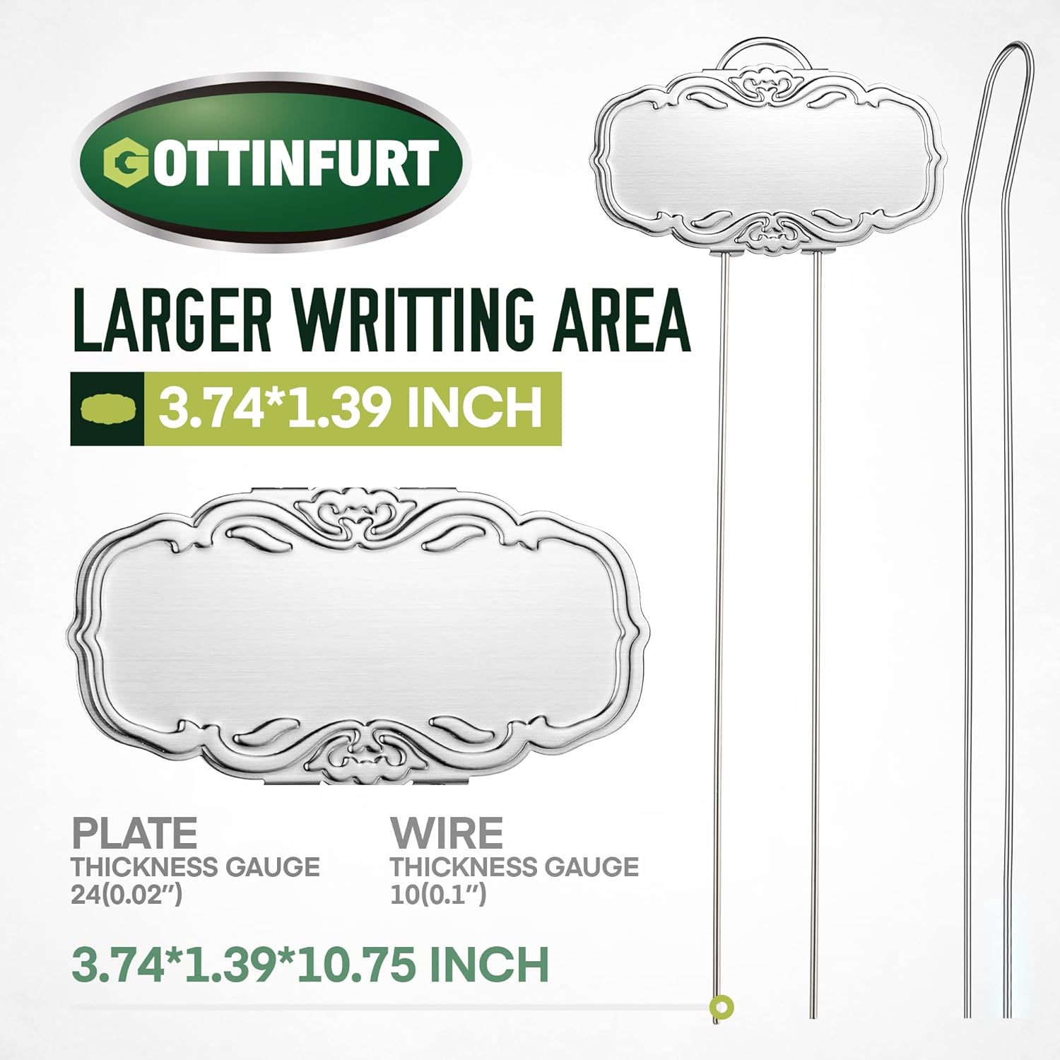 - The whimsical arch design creates a warm and romantic garden atmosphere. Each nameplate measures 3.74x1.39inches, allowing for plenty of space to write on. The sturdy 10.75โ double pronged stakes are easy to insert into the soil and read the labels from a standing position.