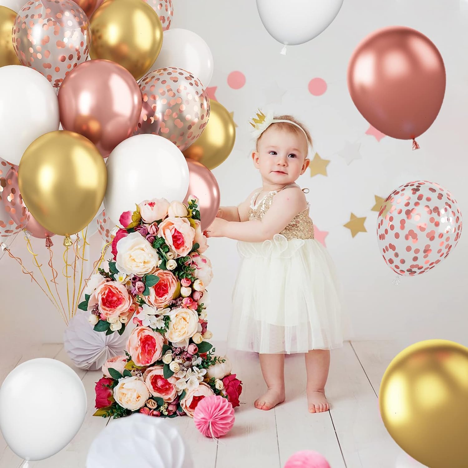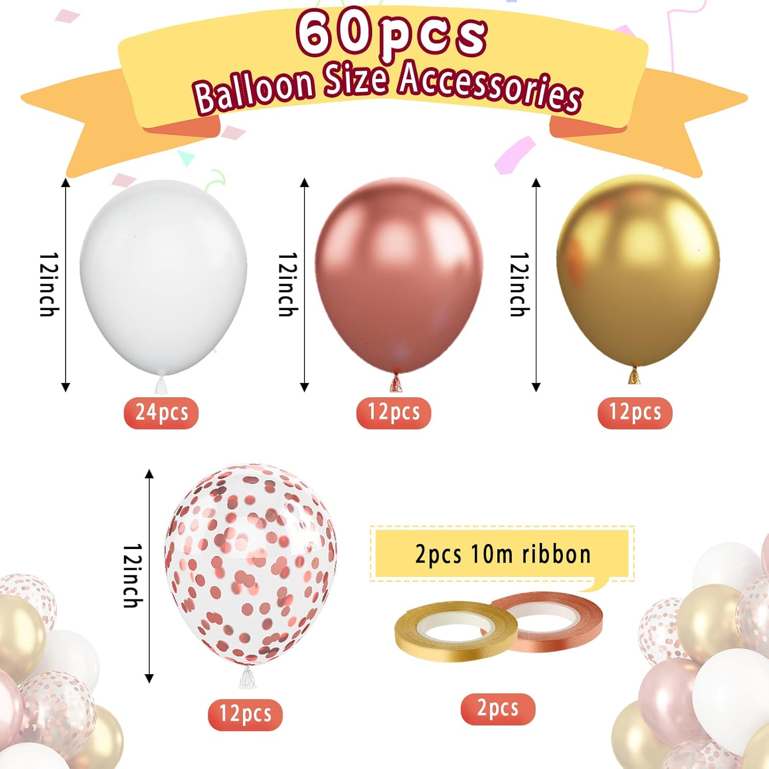 - Mixed Balloons Set: The 12 inch rose gold and white balloons set includes 12pcs metallic gold balloons, 24pcs matte white balloons, 12pcs metallic rose gold balloons, 12pcs rose gold confetti balloons, 2 roll of ribbon. 62pcs in total. A variety of gold latex balloons are suitable for your beautiful art theme decoration.