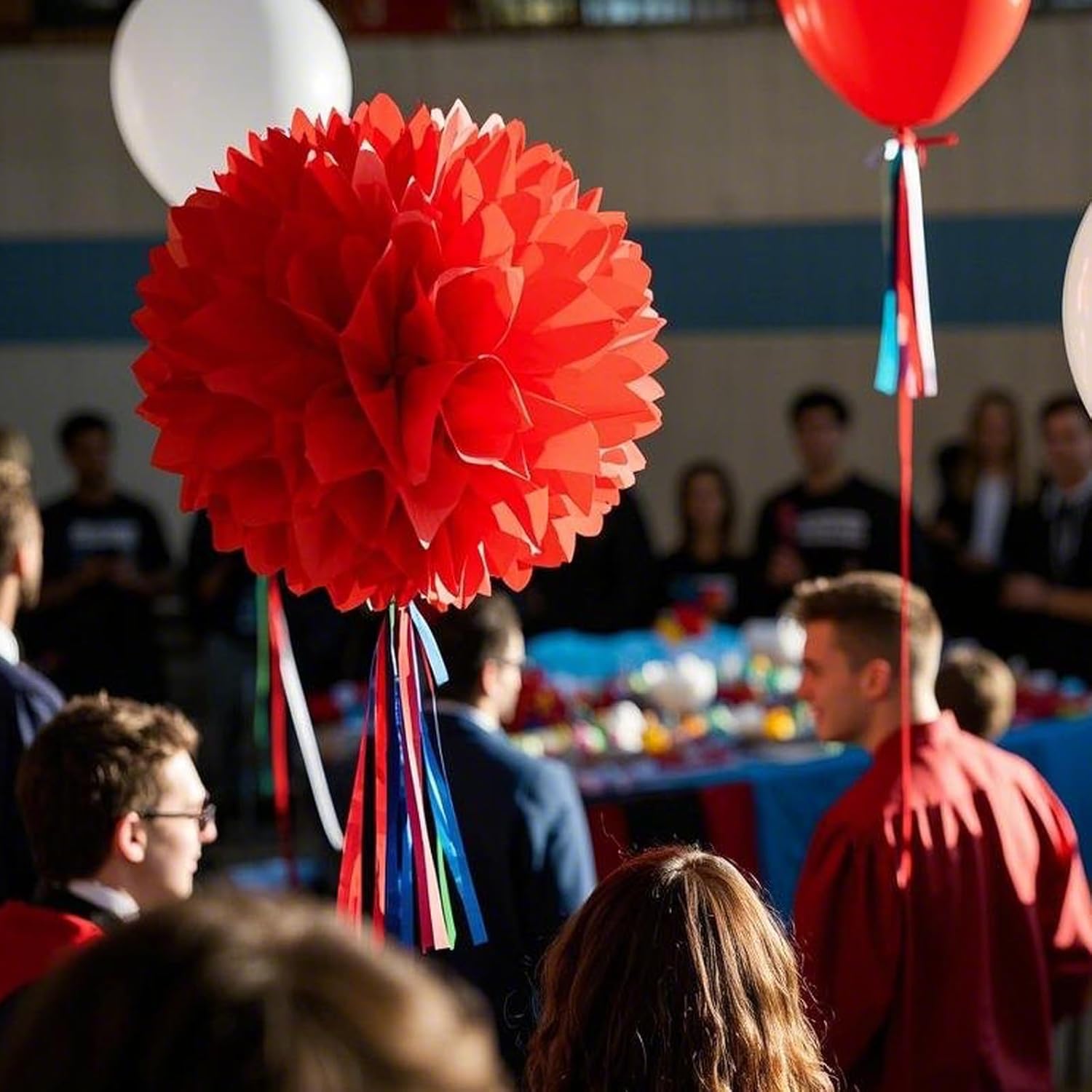 - Precut and folded, simply separate each pom pom paper layer and fluff. A hanging ribbon is included for each paper pom pom.It might be used for indoor and outdoor events, as photo backdrop, as room, table, or chair decoration, hung on ceilings, tents or trees