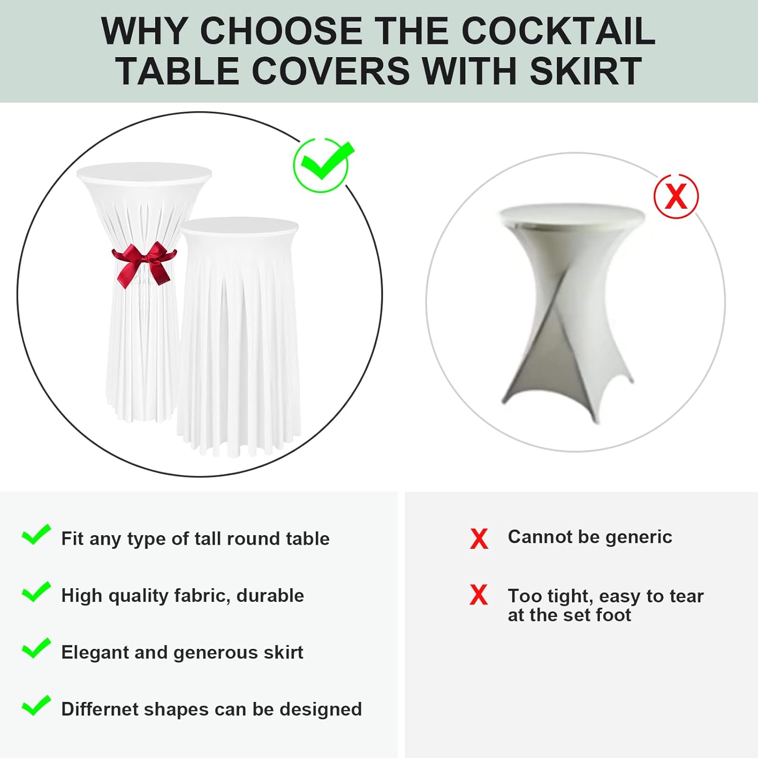 - Easy to Install - All you need to do is put the tablecloth on, and you can set the cocktail table tablecloth by making simple adjustments. You can also use a ribbon to tie the table skirt to dress up your party more elegantly