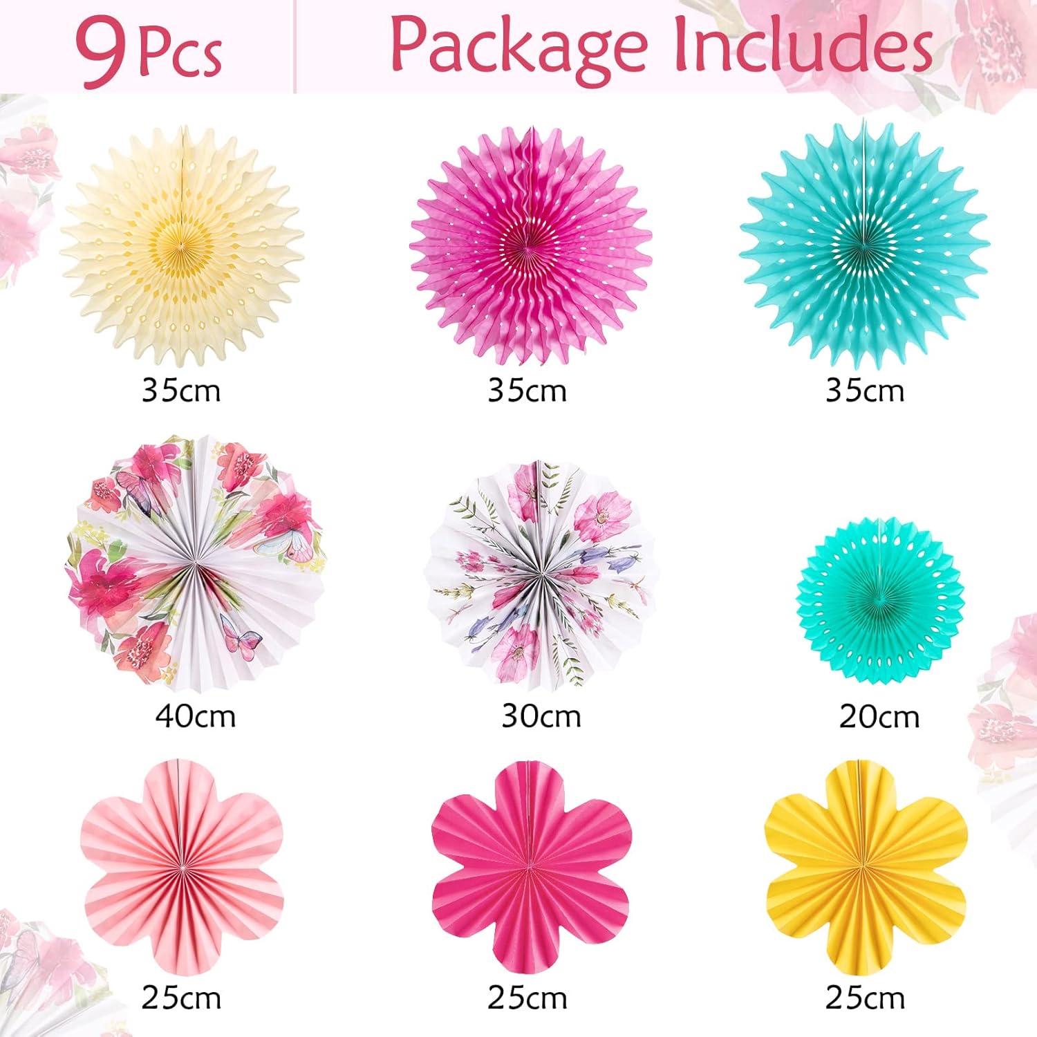 - Party decoration set: you will receive 10 different sizes of hanging paper fans, including 3 x 13.8 inch paper fans (rose sky blue light yellow), 3 x pieces 9.8 inch flower paper fans (pink light pink yellow), 1 x 7.8 inch light green paper fan, 1 x 15.7 inch colourful paper fan, 1 x 13.8 inch colourful paper fan.