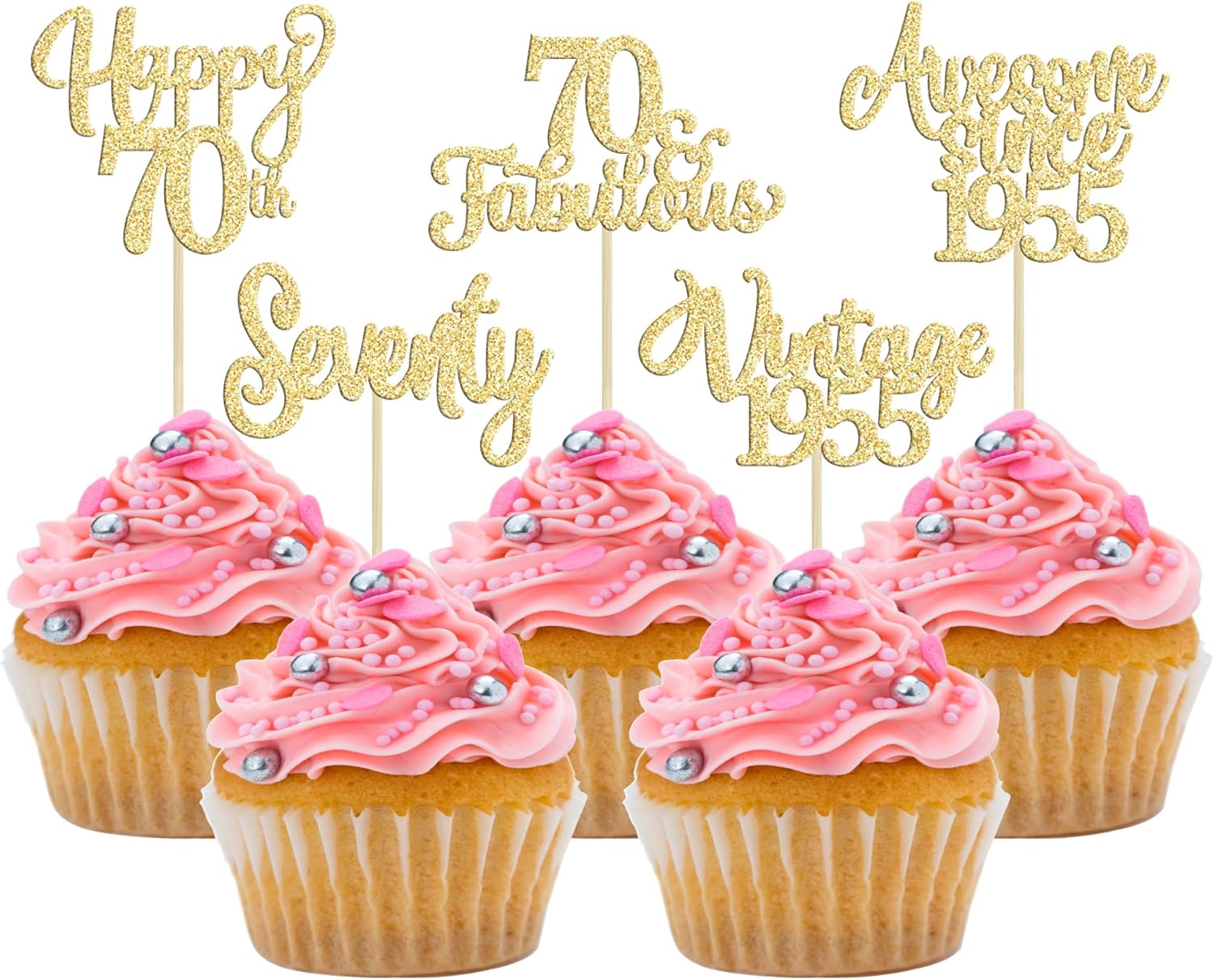 30Pcs Vintage 1955 Cupcake Toppers Glitter Seventy Happy 70th Birthday 70 Fabulous Cupcake Picks Cheers to 70 Years for 70th Birthday Wedding Anniversary Party Cake Decorations Supplies Gold